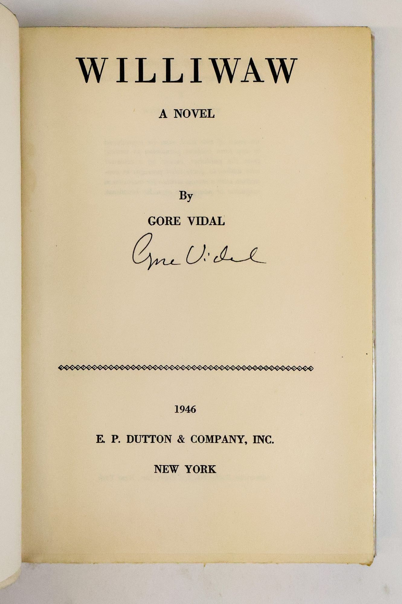New York, NY: E.P. Dutton & Company, Inc, 1946. First Edition. Hardcover. Octavo, 222 pages. In Good plus condition with a Good condition dust jacket. Black spine with blue wave designs and white lettering. Dust jacket is wrapped in a mylar covering, price is uncut "$2.50", has mild shelving wear, light chipping along the extremities, bending wear along the head and tail edges, and mild age-toning throughout. Boards have mild wear along the head and tail edges, and light fraying along the corners. Textblock has light soiling on few pages, stains on the end-pages and pastedowns, mild wear along the edges, and moderate age-toning along the edges. Signed flat by Gore Vidal on the title page. DL consignment. Shelved Room C. Stated "First Edition" on the copyright page.