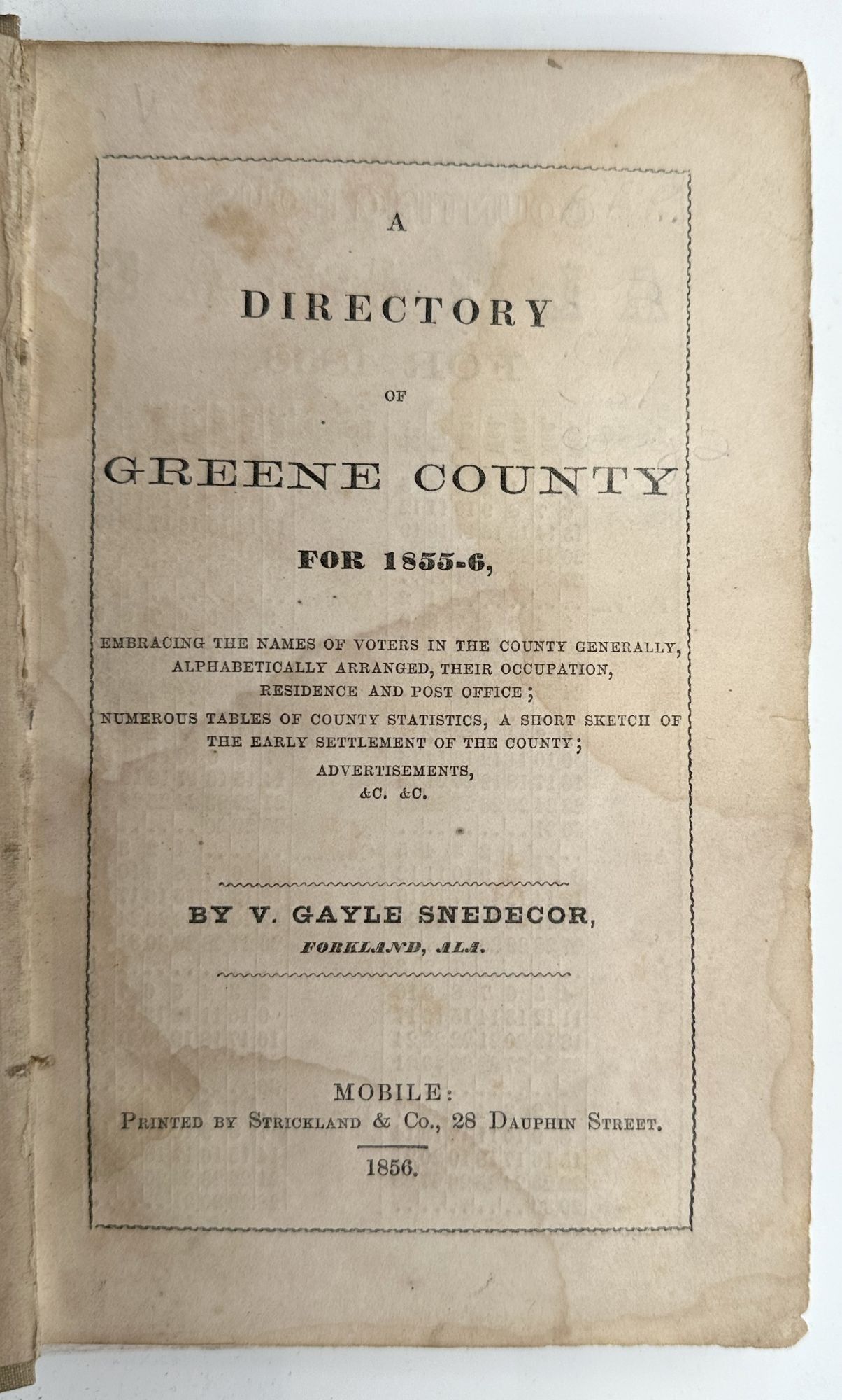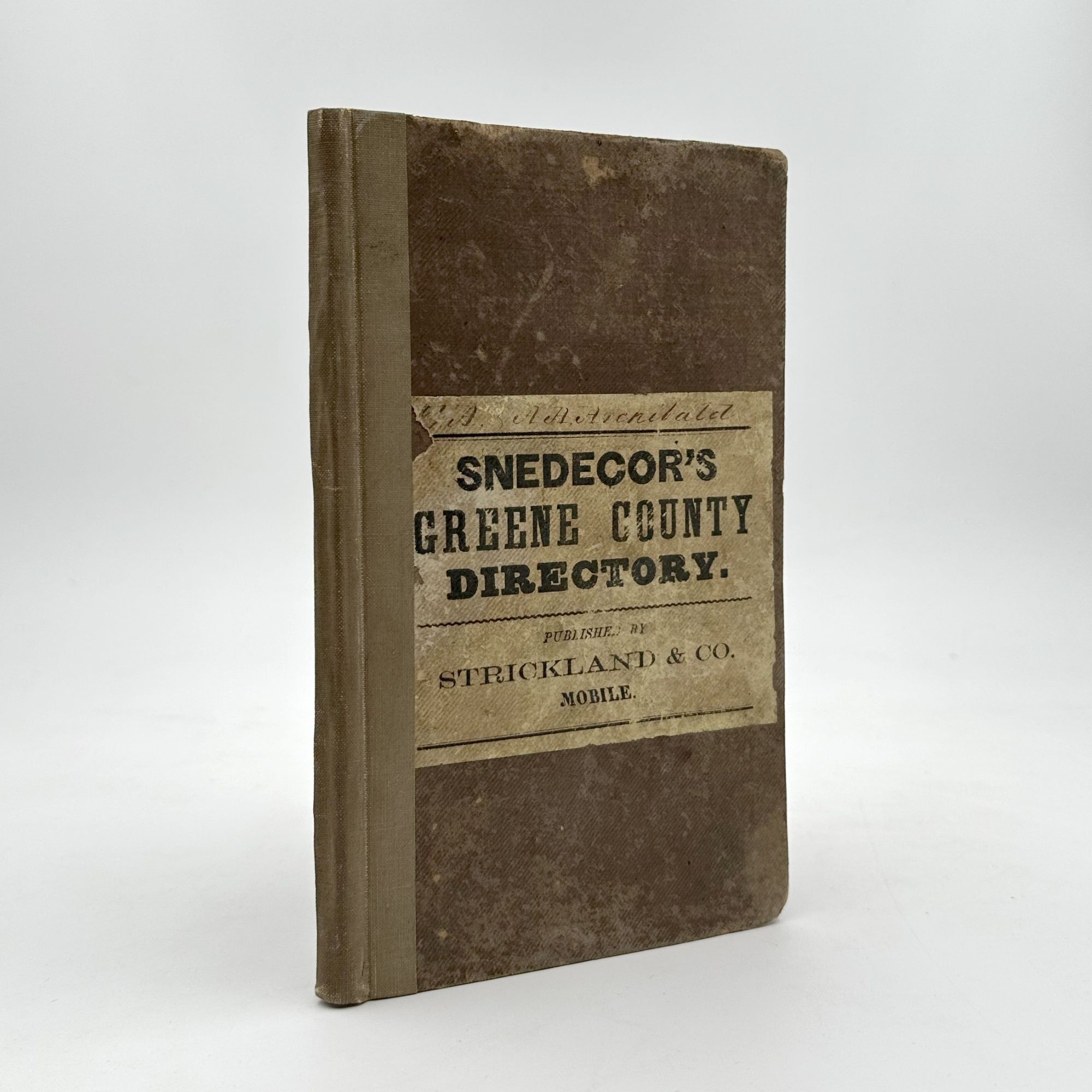 Mobile: Printed by Strickland & Co, 1856. [2],74pp. including errata, plus [24]pp. of advertisements at rear. 8vo. Publisher's cloth, letterpress label on the upper cover, rebacked with cloth at an early date, hinges reinforced with cloth. Minor staining. Provenance: William Martin (signatures, listed as a planter on p. 29. [2],74pp. including errata, plus [24]pp. of advertisements at rear. 8vo. Scarce and early directory for this west-central Alabama county. Aside from the lengthy directory of residents, there is information on birthplaces of Greene County residents and religious denominations, as well as several pages of advertisements giving information on commercial houses in Mobile and other parts of the state. Howes mentions a map, and notes that it was "not issued in all copies." As Owen notes, the map was issued separately, and is not to be found with the book, though the directory listings provide references to it. It is not mentioned by Spear, and Owen describes it separately in his section on Alabama maps. "The whole work abounds in detail, and possesses an interest that does not usually attach to such an effort" (Owen). Spear, p.138; Owen, Alabama, p.1167; Howes S736, "aa"; Sabin 85375a