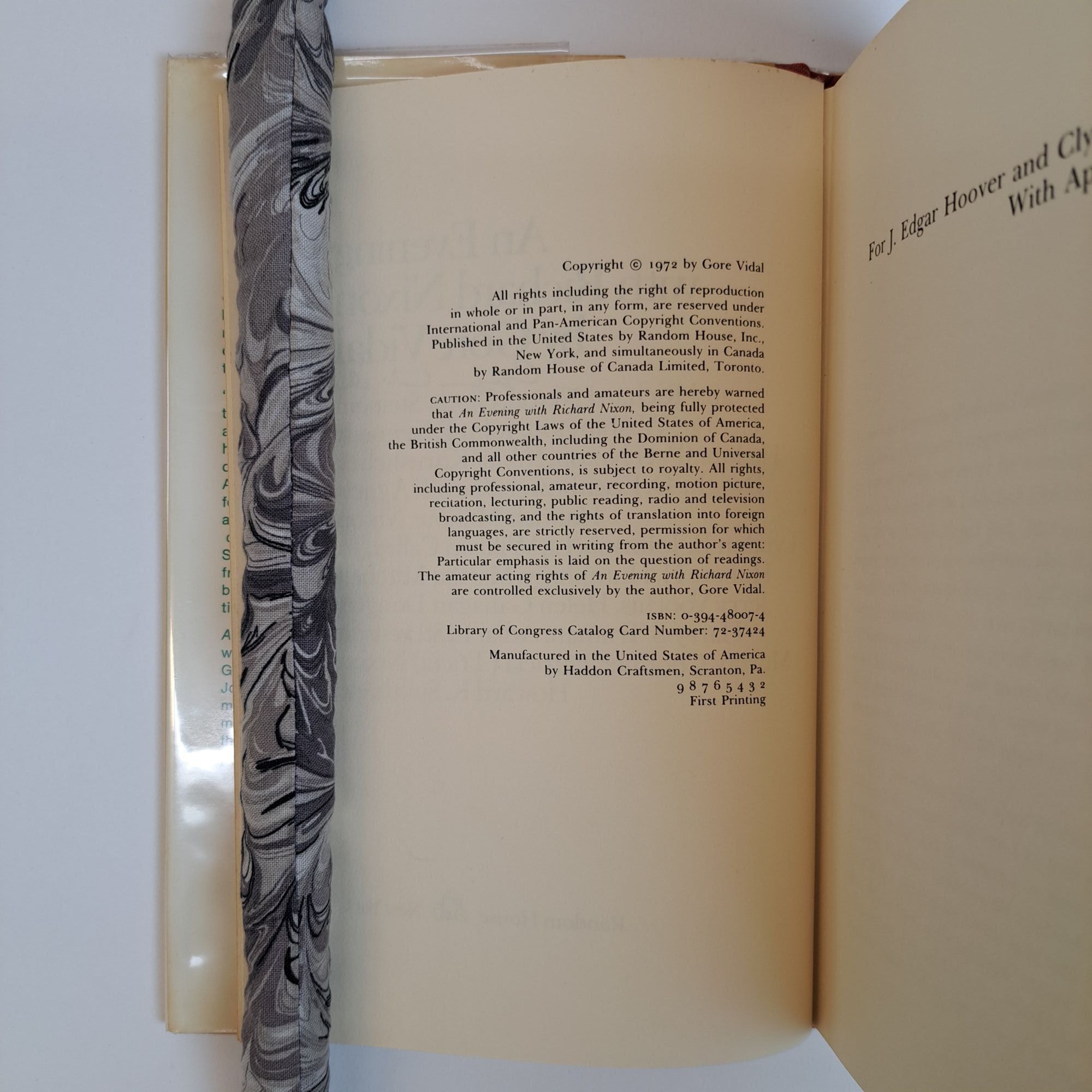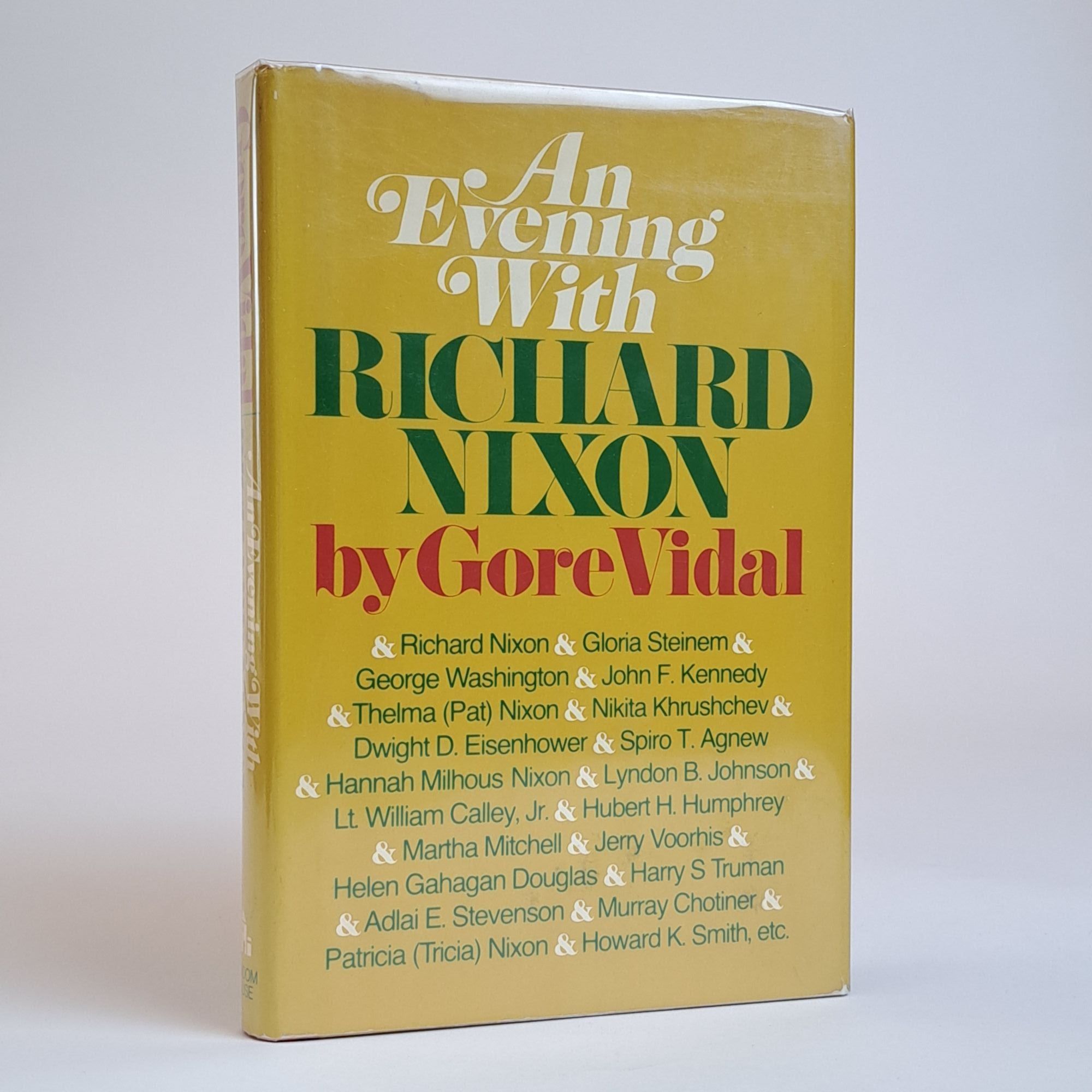 New York, NY: Random House, 1972. First Edition, First Printing. Hardcover. Octavo, x, 157 pages. In Very Good condition with a Very Good minus condition dust jacket. Gold spine aged yellow-green with green, red, and white lettering. Dust jacket is wrapped in a mylar covering, price is uncut "$4.95", has mild shelving wear, stains on the spine and front cover, and has moderate age-toning along the spine. Boards have mild bending wear along the fore corners, and mild wear along the head and tail edges. Textblock has adhesive stains on the end-pages and pastedowns, pen marks on the front end-page, mild wear along the edges, and light foxing along the head edge. Signed flat by Gore Vidal on the title page. Shelved Room C. 1393939. Special Collections.