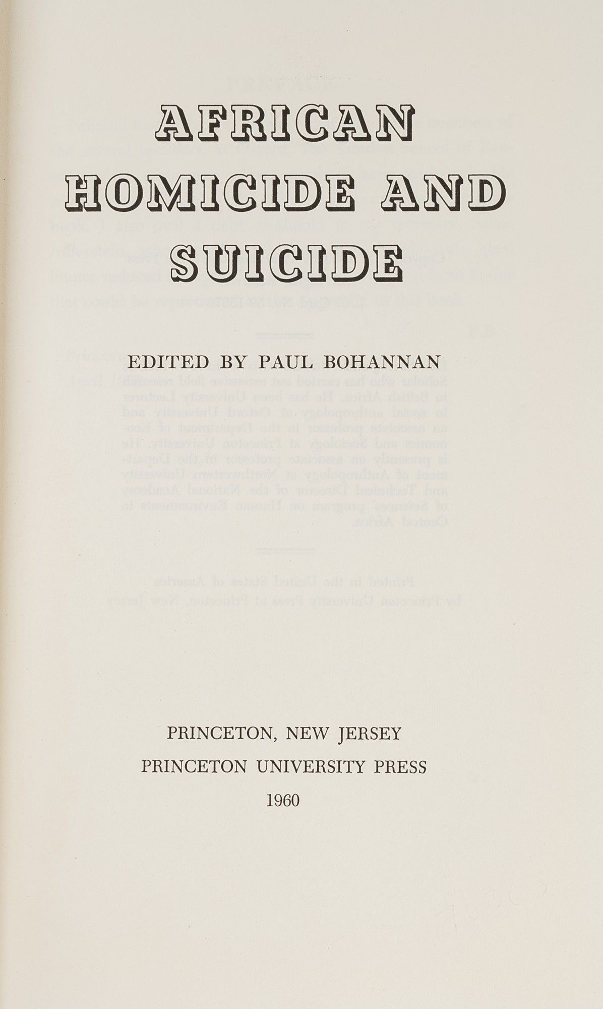 1960. Princeton University Press, 1960.. Princeton University Press, 1960. Bohannan, Paul. African Homicide and Suicide. Princeton: Princeton University Press, 1960. xviii, 270 pp. Illustrations. Publisher's cloth hardcover in worn and soiled price clipped dust jacket. Internally clean. $35. * A collection of ethnographic case studies exploring the cultural contexts of homicide and suicide in several traditional African societies. The book aims to move beyond simple statistics by showing how killings and self-inflicted deaths are understood and responded to within different social structures. The volume is comprised of contributions from various anthropologists detailing specific tribal societies. Bohannan himself contributed a chapter on homicide among the Tiv of central Nigeria. Other included societies are the Gisu and Basoga of Uganda. The analysis emphasizes the relationship between homicides and the social institutions in which they occur, particularly the family and domestic sphere. By examining "culpable homicides," or acts deemed wrong by the society, Bohannan identifies points of stress and conflict within the social structure. The studies reveal that while patterns of violence within domestic institutions are often similar, the reasons for killing differ considerably in non-domestic settings. The book explores how different cultures classify homicides, distinguishing between culpable and non-culpable types, such as the killing of witches or thieves. The included ethnographic accounts also detail the cultural views and beliefs surrounding suicide. For example, the Gisu people saw suicide as a result of uncontrollable "temper" and viewed it as evil and contagious. This book is a significant contribution to legal anthropology, particularly in how it documents and analyzes indigenous legal systems and their responses to violence. The analysis is built on case histories collected by the researchers.