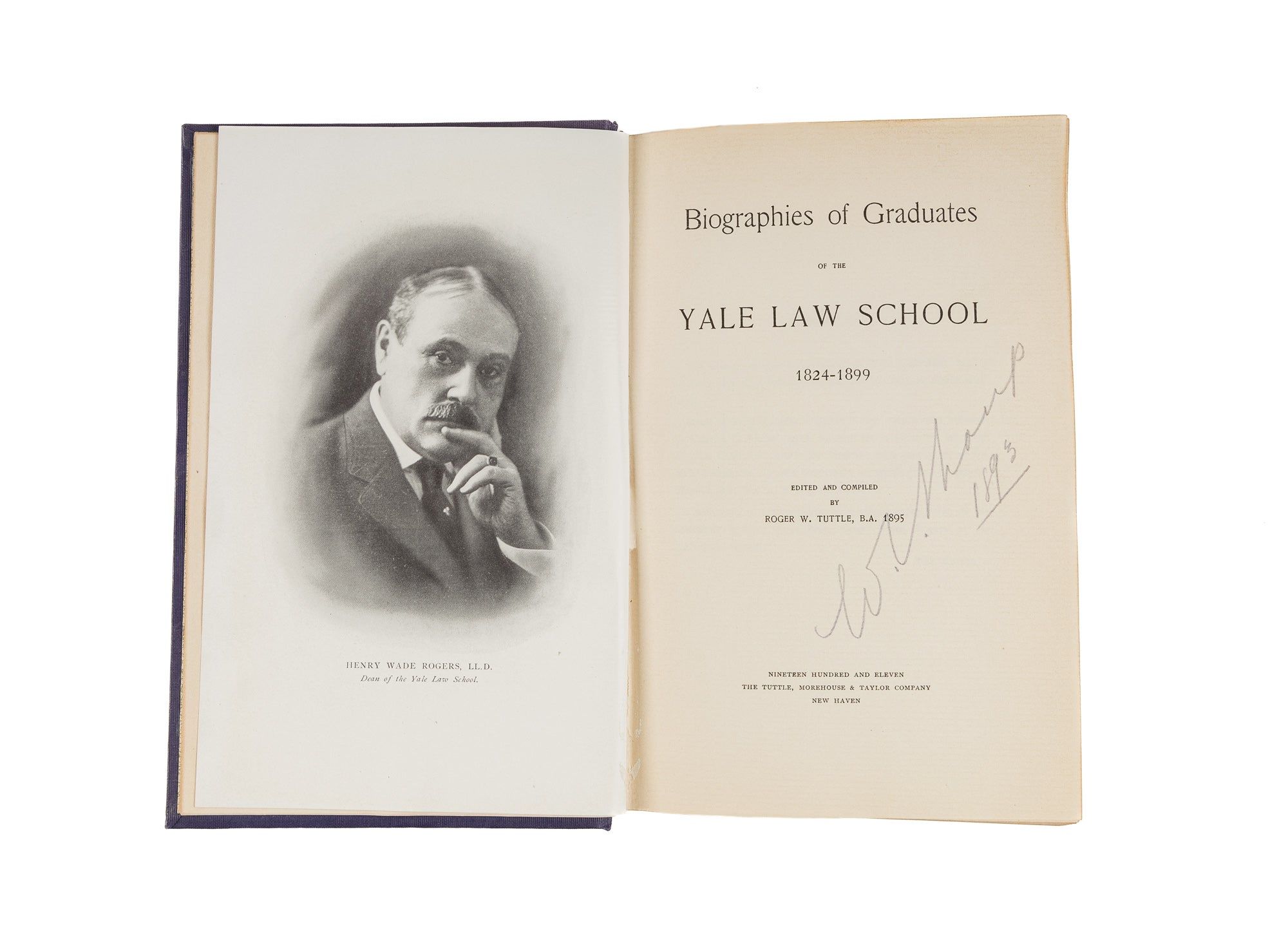 1911. Tuttle, Roger W[alker], Editor. Biographies of Graduates of the Yale Law School, 1824-1899. New Haven: Tuttle, Morehouse & Taylor Co., [1911]. 1065 pp. Portrait. Original purple cloth with gilt stamped spine and front cover. Moderate shelfwear and soiling. Fading to spine and boards. Patterned endpapers. Inscription of "Walter Campbell Shoup/ 1895" to title page. Pencil annotations describing signature to flyleaf, otherwise internally clean. $150. * Shoup [1872-1945] was the son of United States senator and first governor of Idaho, George L. Shoup. Shoup graduated from Yale Law School in 1893. "Much of the biographical matter in this volume was collected by Charles C. Brown, '03 S., through the office of the secretary of Yale University, under the direction of a committee of the Yale Association of Class Secretaries, of which Hon. Charles H. Sherrill, B.A. '89, L.L.B. '91, was chairman" (Foreword).