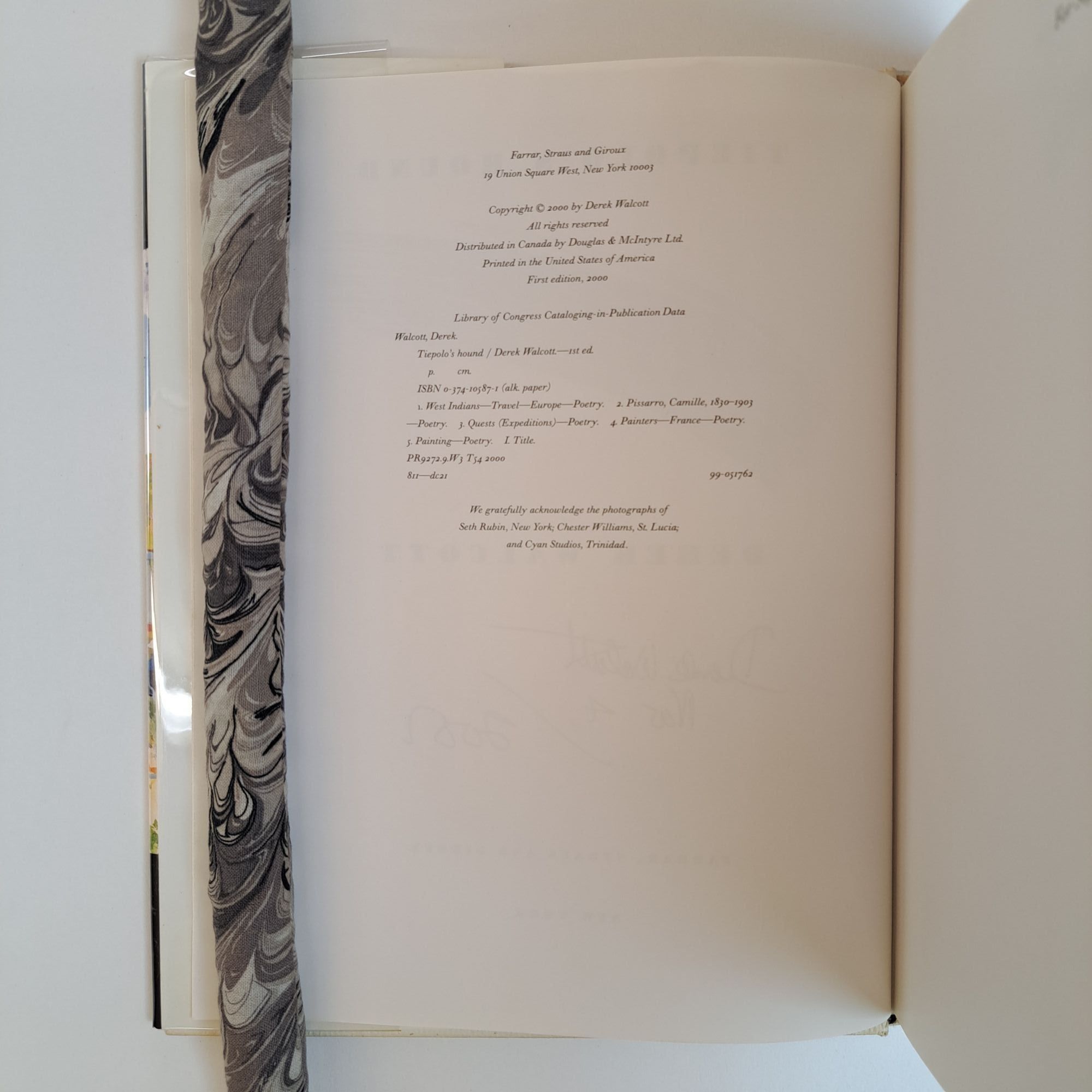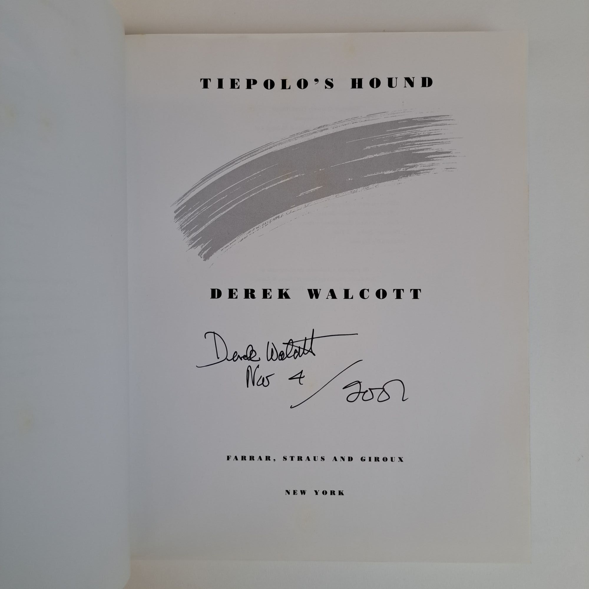 New York, NY: Farrar, Straus and Giroux, 2000. First Edition, First Printing. Hardcover. Large Octavo, 163 pages. In Very Good condition with a Very Good condition dust jacket. Black spine with light pink lettering. Dust jacket is wrapped in a mylar covering, price uncut "U.S.A $30.00/ Canada $47.00", has mild shelving wear. Boards are slightly warped, has mild bending wear along the spine head/tail and fore corners. Textblock has light stains on pages 20-21, and the half-title and title page, minor soiling on the pastedown pages and end-pages, and light stains along the edges. Dated "Nov 4 2000" and signed by Derek Walcott on the title page. Shelved in Room C. 1393981. Special Collections.