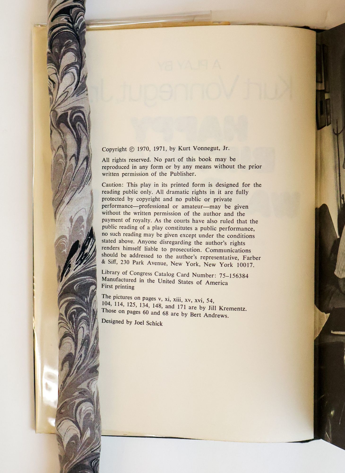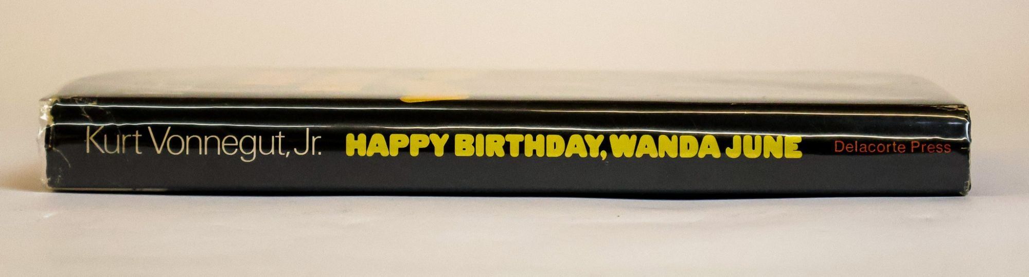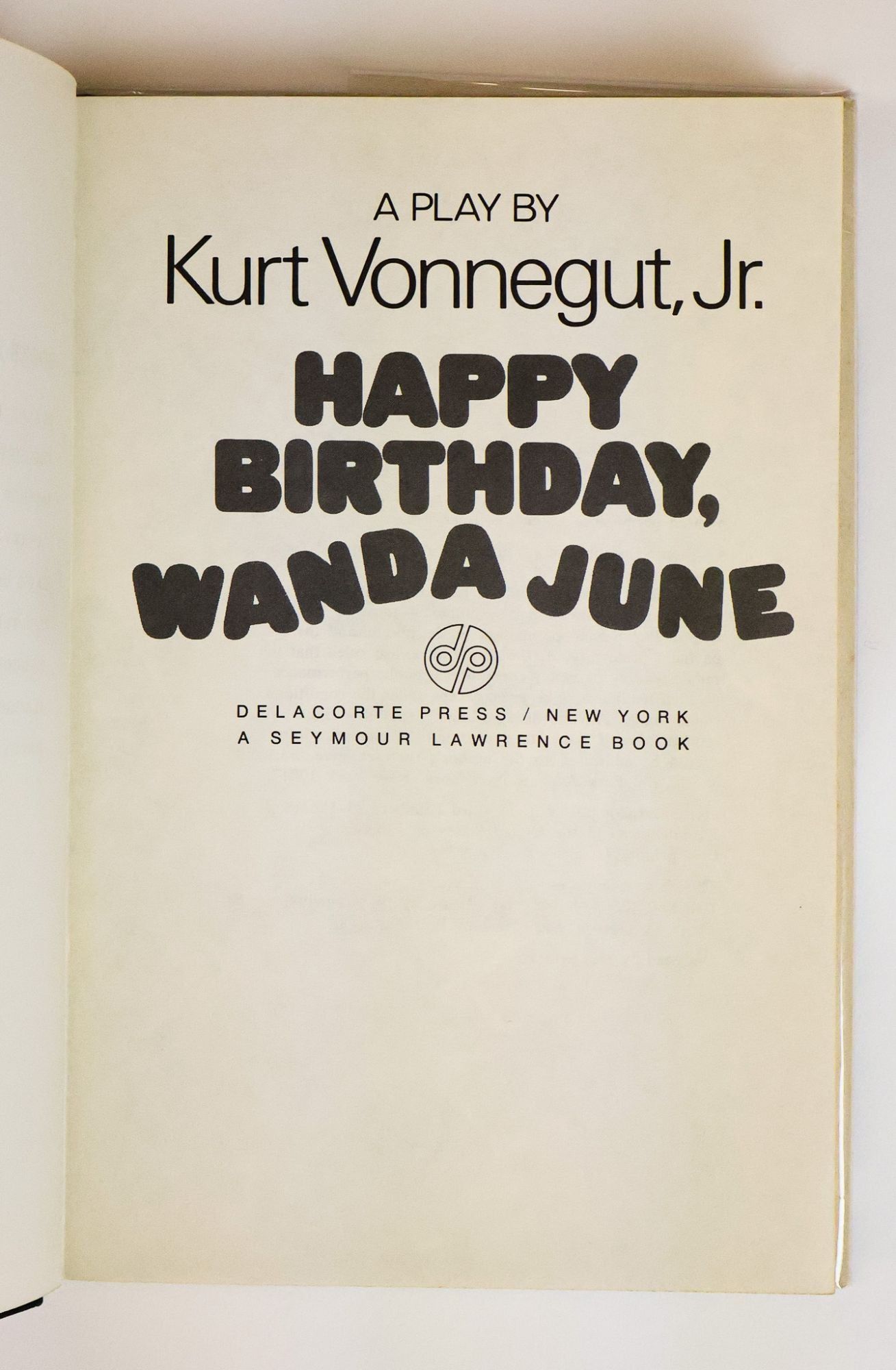 Kurt Vonnegut, Jr.'s first published play, "Happy Birthday, Wanda June" originated as a play titled "Penelope" and would be first performed at the Orleans Theater in Orleans, Massachusetts in 1970. It would see a film adaptation in 1971, the same year a printed publication of the play released. 1393995. Shelved Dupont Bookstore.