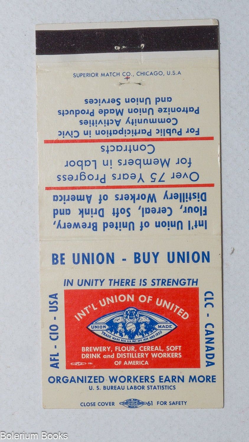 Be Union - Buy Union / In Unity there is Strength / Int'l Union of United Brewery, Flour, Cereal, Soft Drink and Distillery Workers of America [matchbook cover]