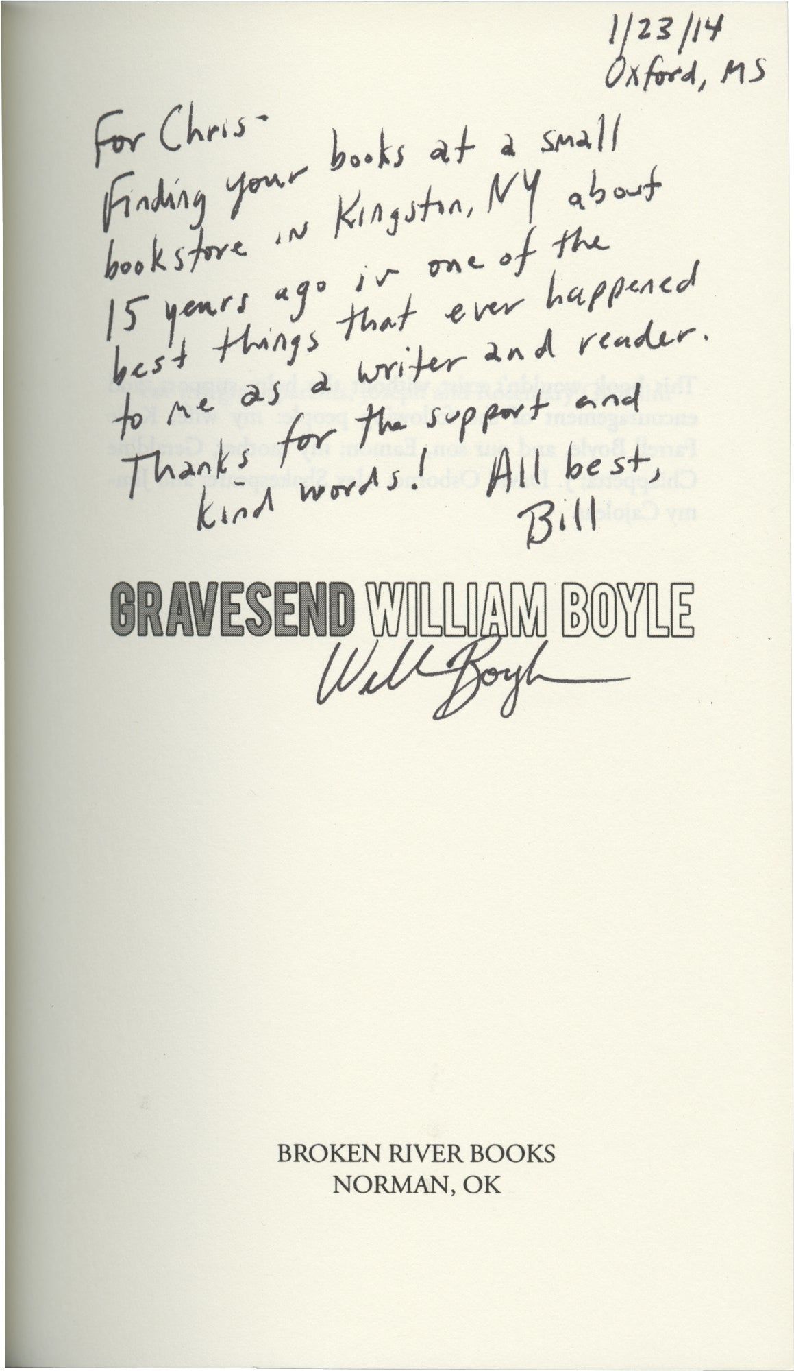 Norman, OK: Broken River Books, 2013. First Edition. First Edition, a trade softcover original. Association Copy, INSCRIBED on the title page to author Chris Offutt: "1/23/14 / Oxford, MS / For Chris / Finding your books at a small bookstore in Kingston, NY about 15 years ago is one of the best things that ever happened to me as a writer and reader. Thanks for the support and kind words! / All best / Bill." Additionally SIGNED below the inscription by Boyle.