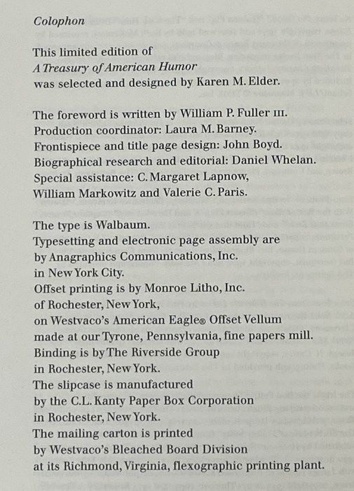 Rochester, New York: Westvaco, 1996. Limited Edition. Hard Cover. Near Fine/Near Fine. 9x6x1. Limited edition. Includes publisher's slipcase. 1996 Hard Cover. 322 pp. 8vo. An anthology of American humor featuring numerous authors, including: Robert Benchley; Irvin S. Cobb; Will Cuppy; Clarence Day; Don Marquis; Ruth McKenney; Ogden Nash; S.J. Perelman; Will Rogers; James Thurber.