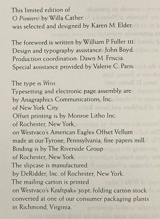 O Pioneers! -- Limited Edition, Westvaco Corporation, Christmas 2000 (Westvaco American Classics Series No. 43, Christmas 2000)
