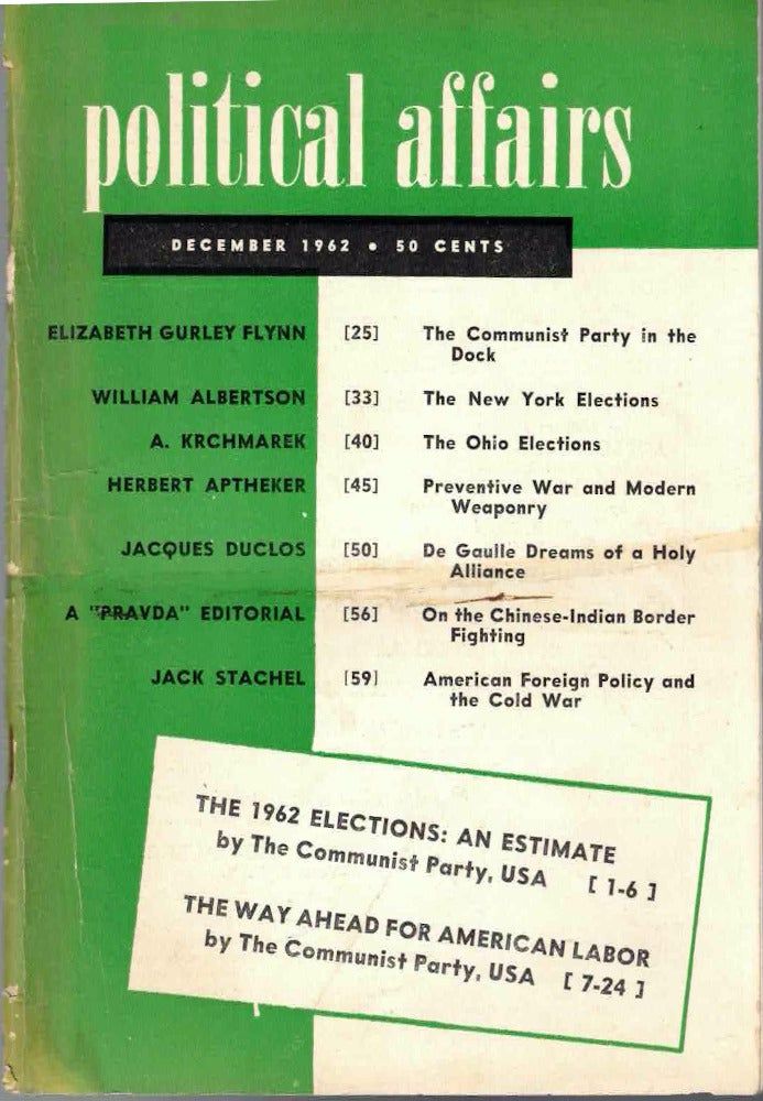 New York: New Century Publishers, 1962. Paperback. Very good. Paperback. 65pp. Rubbed and edgeworn, water stain in the bottom left corner, light soiling to the front, else very good in publisher's stapled wraps. "The 1962 Elections: An Estimate" by Communist Party, U.S.A., "The Way Ahead for American Labor" by Communist Party, U.S.A., "The Communist Party in the Dock" by Elizabeth Gurley Flynn, "The New York Elections" by William Albertson, "The Ohio Elections" by A. Krchmarek, "Preventive War and Modern Weaponry" by Herbert Aptheker, "De Gaulle Dreams of a Holy Alliance" by Jacques Duclos, "On the Chinese-Indian Border Fighting" a 'Pravda' Editorial, "American Foreign Policy and the Cold War" by Jack Stachel.