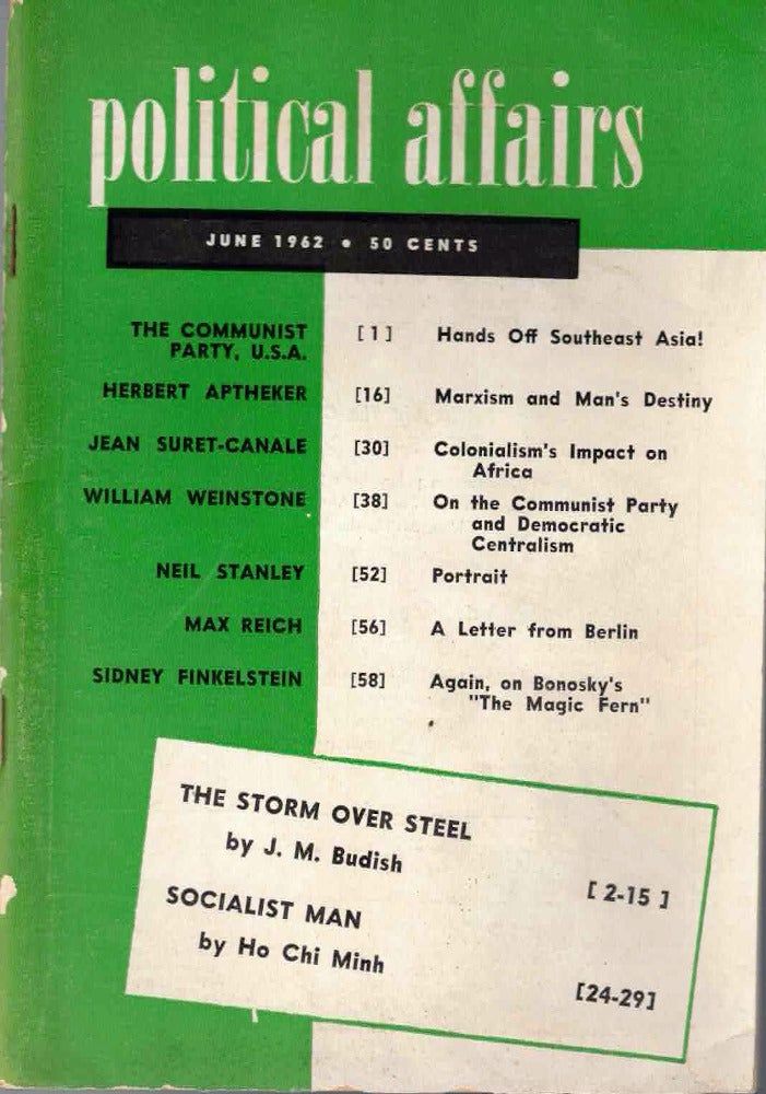 New York: New Century Publishers, 1962. Paperback. Very good. Paperback. 65pp. Rubbed and edgeworn, else very good in publisher's stapled wraps. "Hands Off Southeast Asia!" by The Communist Party, U.S.A., "The Storm Over Steel" by J. M. Budish, "Marxism and Man's Destiny" by Herbert Aptheker, "Socialist Man" by Ho Chi Minh, "Colonialism's Impact on Africa" by Jean Suret-Canale, "On the Communist Party and Democratic Centralism" by William Weinstone, "Portrait" by Neil Stanley, "A Letter from Berlin" by Max Reich, "Again, on Bonosky's 'The Magic Fern'" by Sidney Finkelstein.