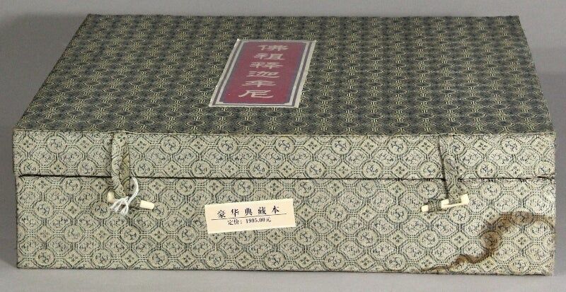 Beijing: China Tibetology Press / Xinhua Bookstore Beijing Publishing House, 1999. Boxed collection, 14¾" x 13¾" x 4", containing the following: 釋迦如來應化事蹟 [= The Deeds of Sakyamuni Tahtagata]. 4 vols., 13¼" x 12½", facsimile text with full-page facsimile illustrations on every recto; stab stitched in blue paper wrappers, vol. 4 rather waterstained with vol. 3 also affected in lower half, text otherwise clean; 金剛般若波羅蜜經 [= The Diamond Sutra]. 13¼" x 12½", pp. 85, [1]; 法界源流图 / Fa jie yuan liu tu [= The Thousand Buddhas Diagram]. 13¼" x 12½", 38 loose leaves, some folding, and 3 preliminary pieces, the whole being a color facsimile. The scroll depicts over 600 figures, including Buddhas, Arhats, Zen patriarchs, auspicious beasts, religious instruments, and so on. The original scroll was completed in 1767 and is housed in the Jilin Provincial Museum. A few sheets dampstained at the edges. The whole contained in loose board covers.