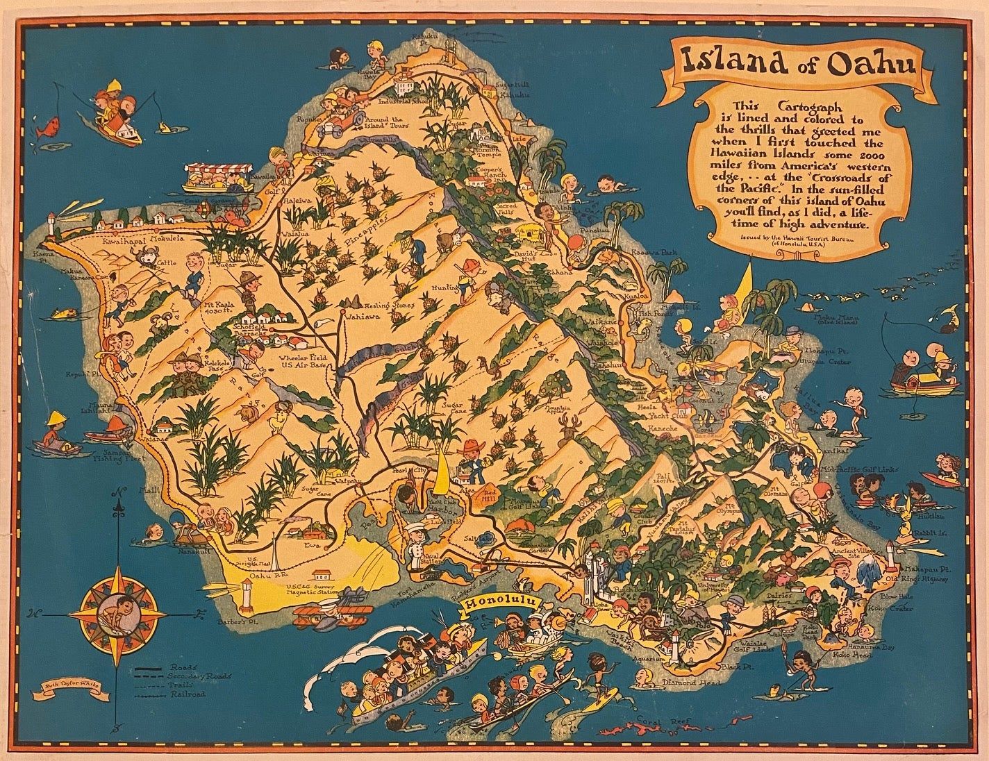 This charming and whimsical 1935 pictorial map by famous illustrator and artist Ruth Taylor White was commissioned by the Hawaii Tourist Bureau. The map depicts the island of Oahu, with the city of Honolulu labeled. Major roads and railways are drawn. Delightful illustrations throughout depict the people, famous landmarks, topographical features, crops, animals, cultural stereotypes, etc. The map is in good condition, with minor creasing to left margin and bottom right corner.