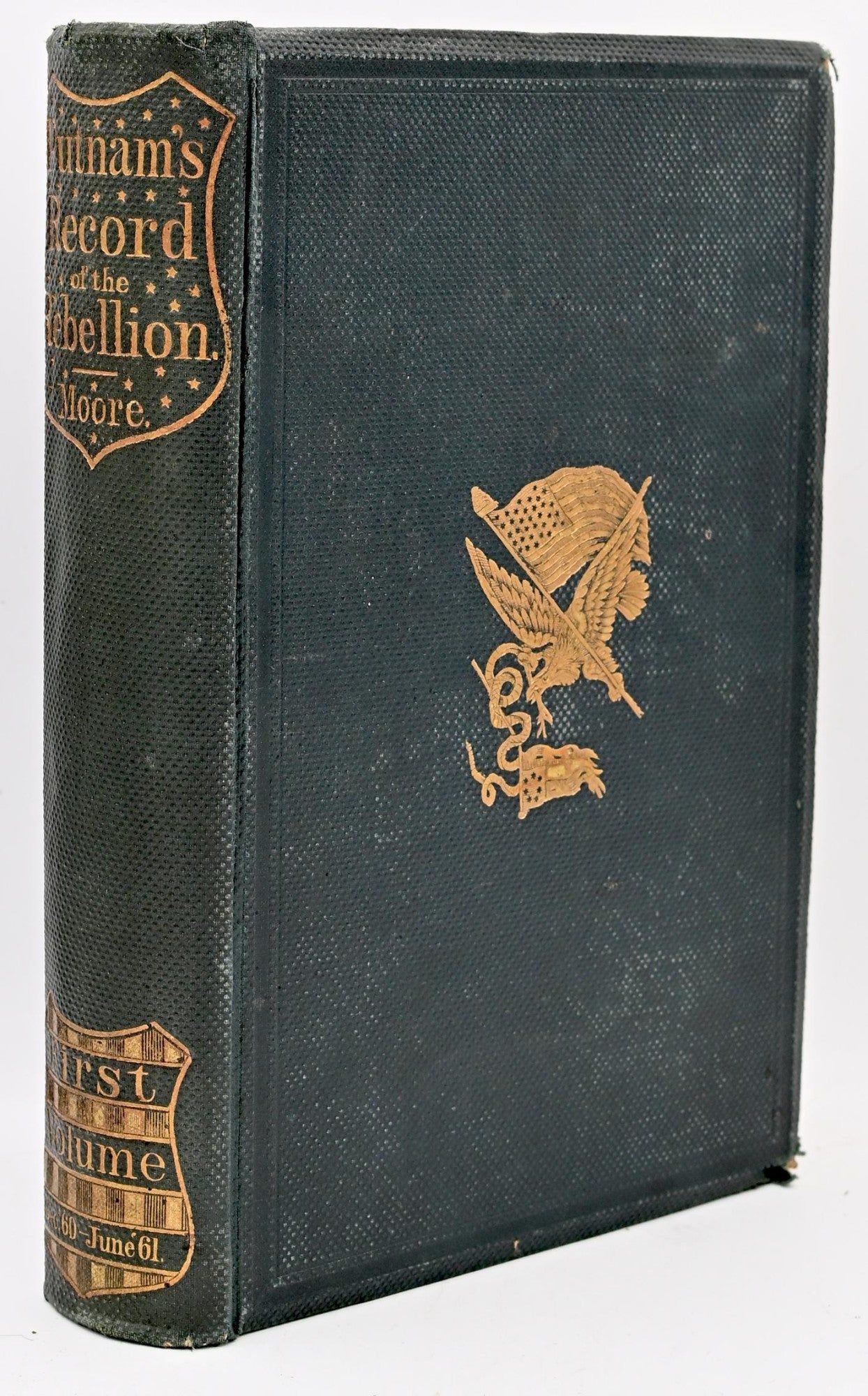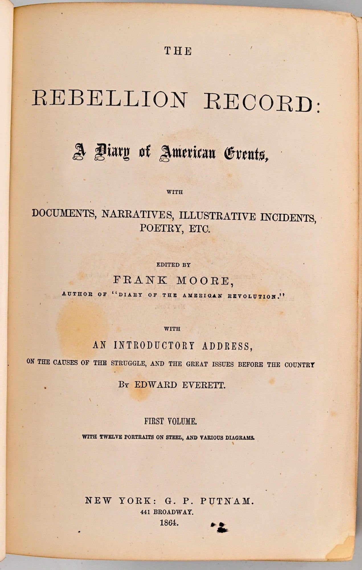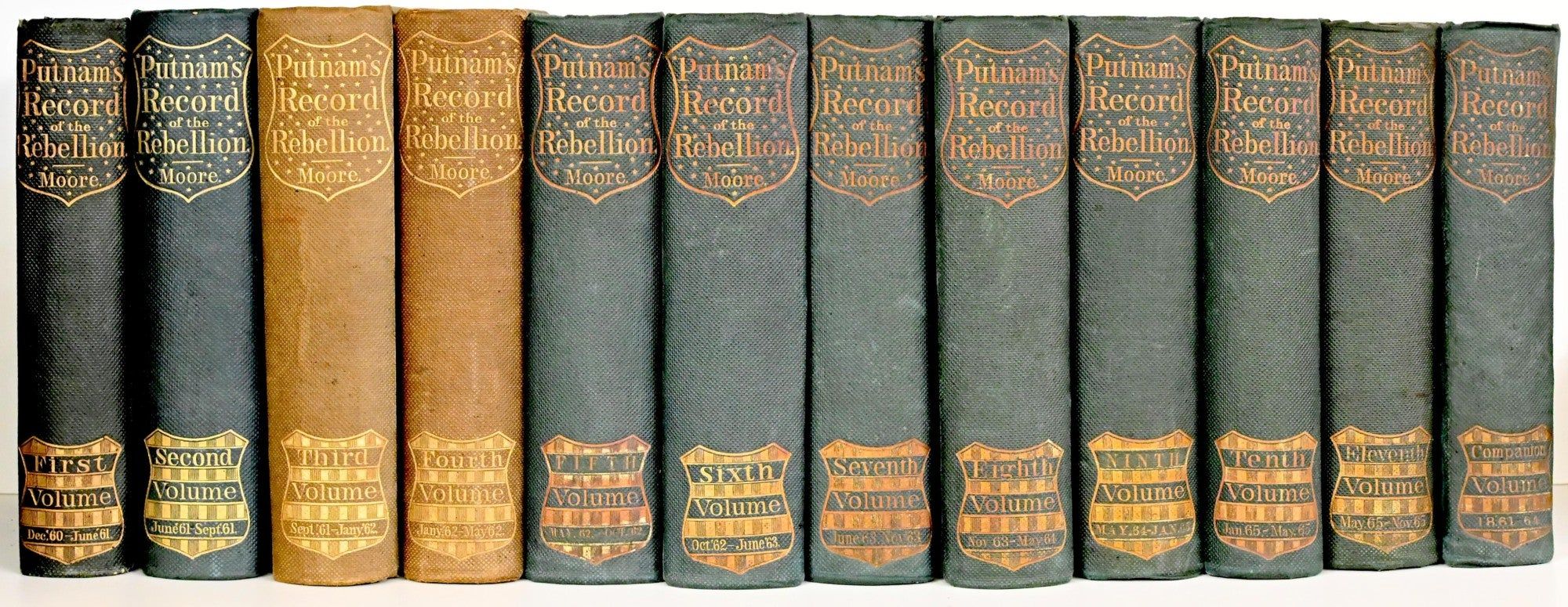 [CIVIL WAR] THE REBELLION RECORD; A DIARY OF AMERICAN EVENTS, WITH DOCUMENTS, NARRATIVES, ILLUSTRATIVE INCIDENTS, POETRY, ETC. WITH AN INTRODUCTORY ADDRESS ON THE CAUSES OF THE STRUGGLE, AND THE GREAT ISSUES BEFORE THE COUNTRY, BY EDWARD EVERETT [12 VOLUMES; COMPLETE SET]