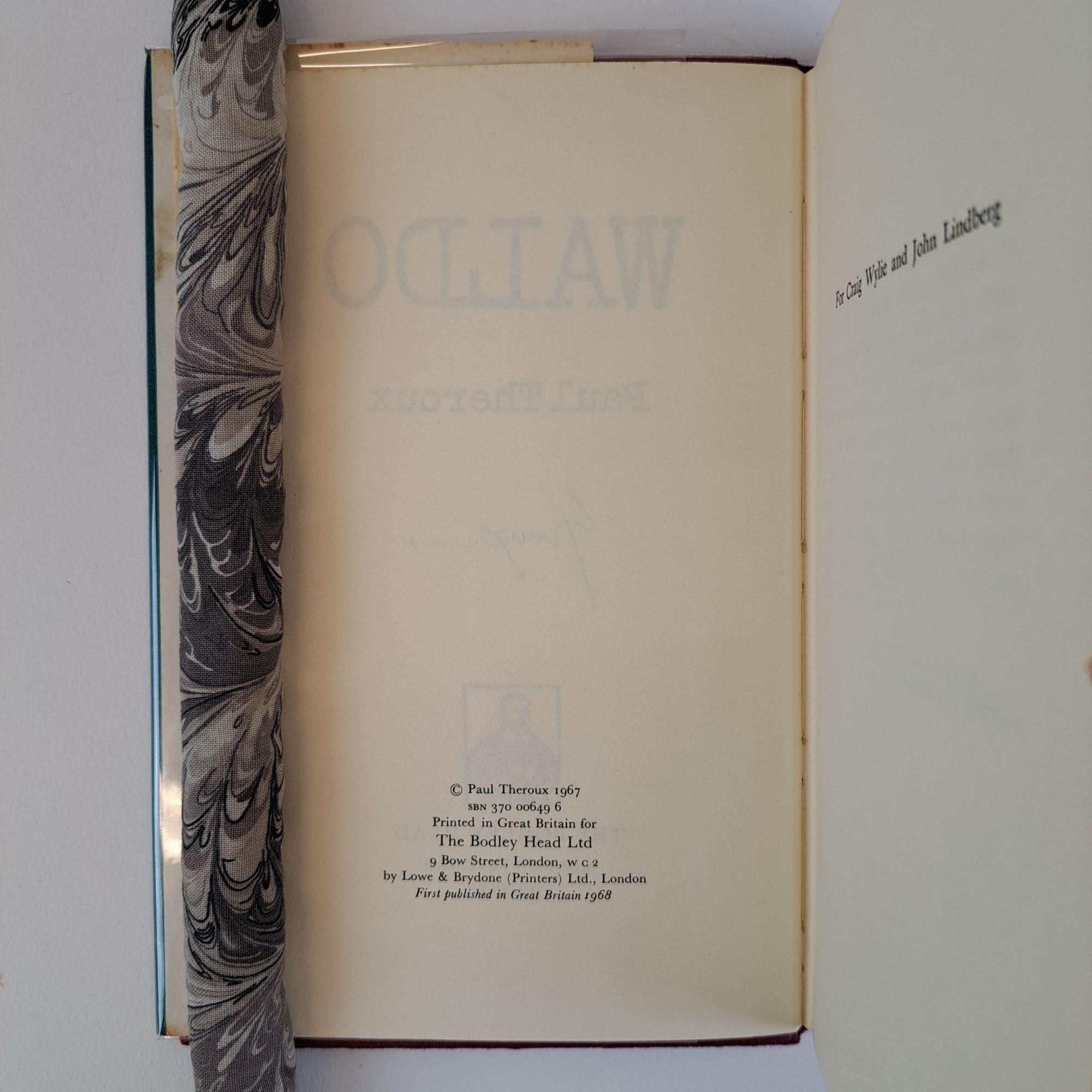 London, UK: The Bodley Head, 1967. First UK Edition, First Printing. Hardcover. Octavo, 208 pages. In Very Good minus condition with a Very Good minus condition dust jacket. Aquamarine spine with green and purple lettering. Dust jacket is wrapped in a mylar covering, price is uncut "21s net", has mild shelving wear, small open tears along the head edges, stains on the front cover, and mild age-toning throughout. Boards have mild wear along the head and tail edges and moderate warping upwards. Textblock is lightly splitting to gutter from front end-page to page 2, has stains on the end-pages and pastedowns, mild wear along the edges, and light foxing along the edges. Signed flat by Paul Theroux on the title page. Shelved Room C. 1394106. Special Collections.