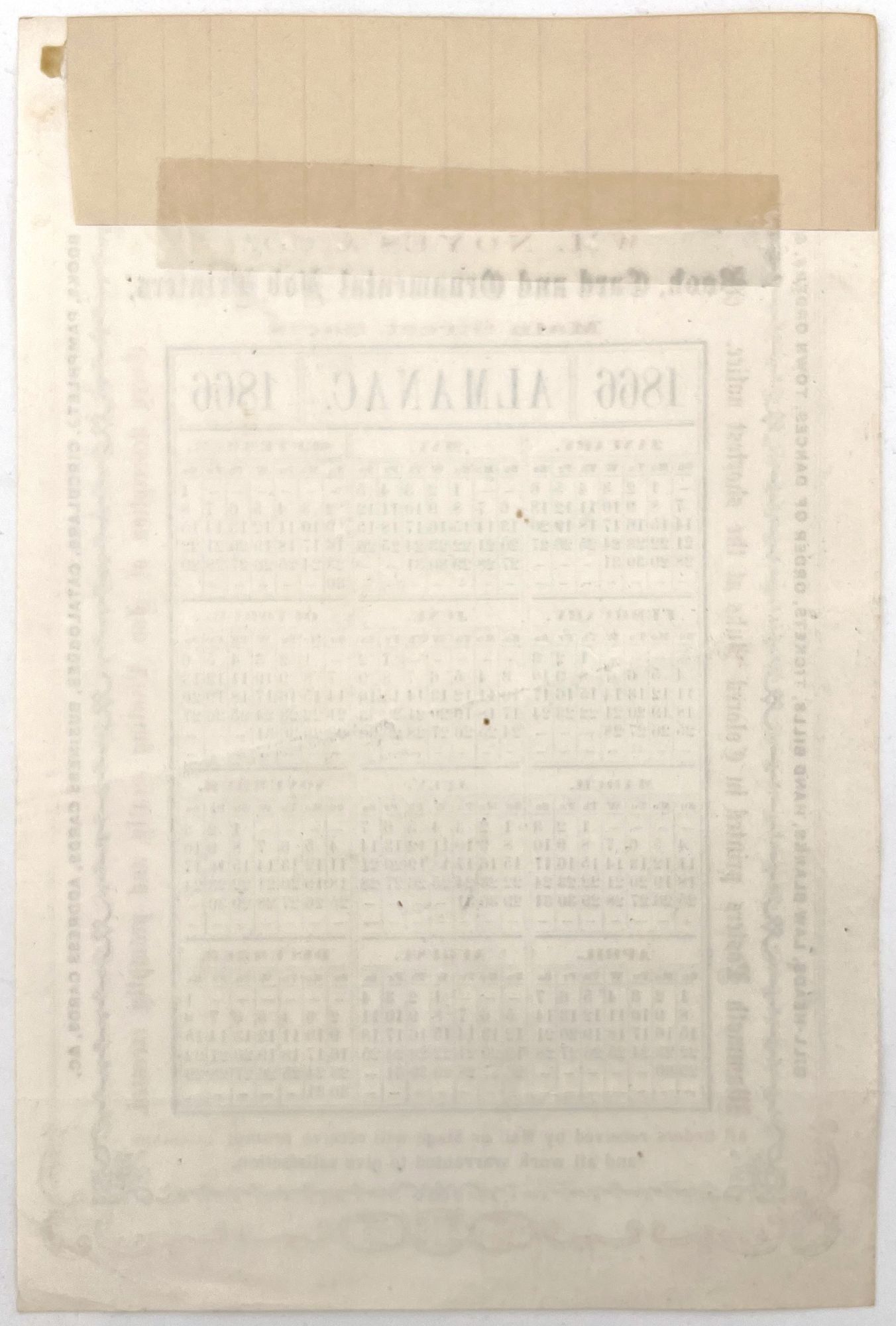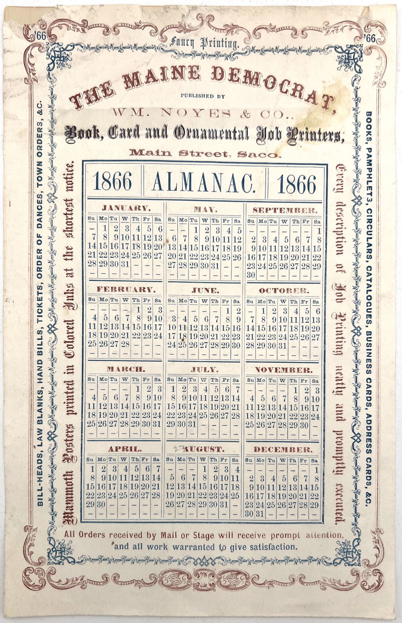 Saco, [Maine]: William Noyes & Co, 1866. Very good. Modern tape and paper repair to verso.. Promotional handbill for the job printer William Noyes & Co., "Book, Card and Ornamental Job printers" and producers of billheads, law blanks, handbills, tickets, business cards, circulars and catalogues. This handbill also promotes The Maine Democrat, and serves as a miniature almanac for the year 1866. Printed in red and blue, measuring approx. 9.25" by 6