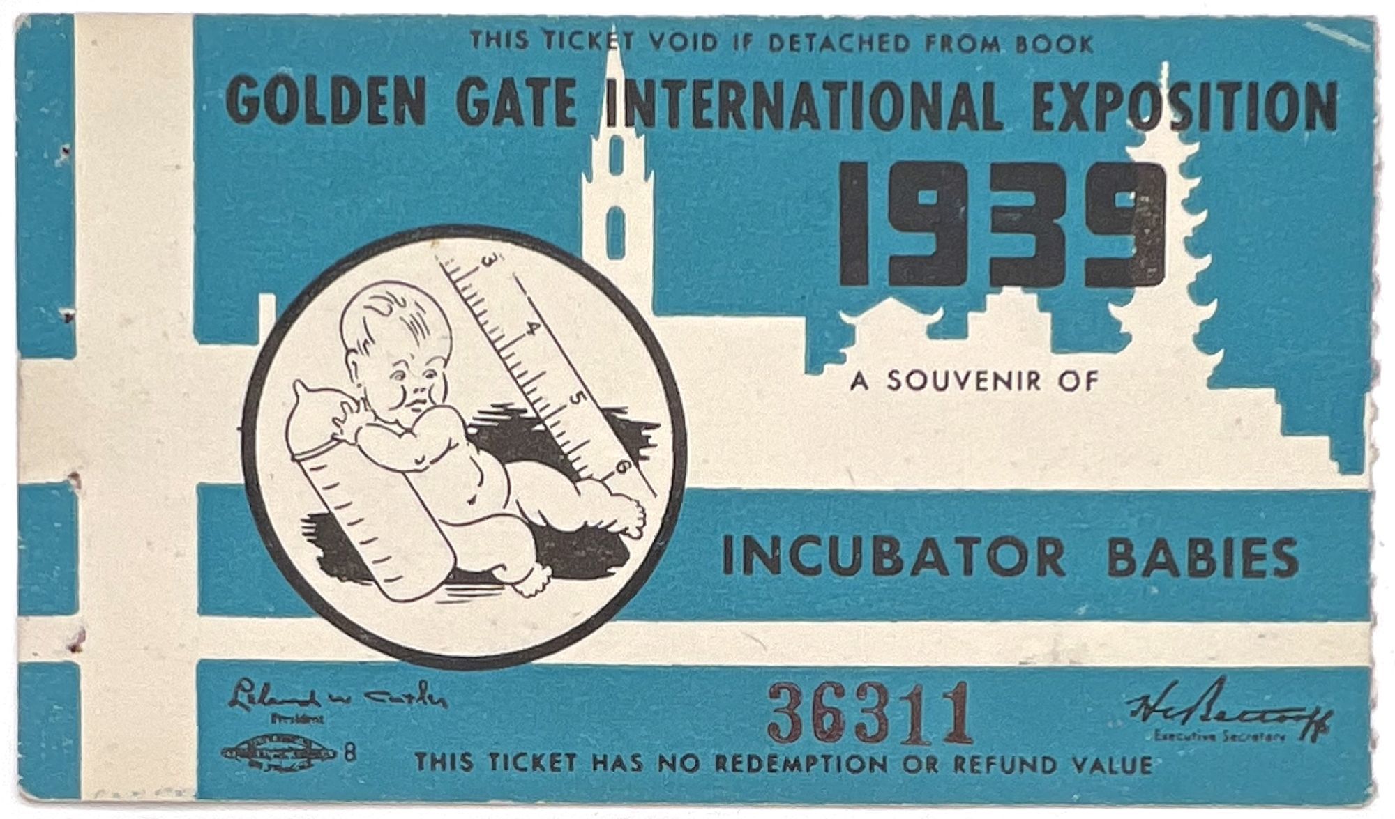 San Francisco, California: Golden Gate International Exposition, 1939. Very good. Used, ticket stub sometime removed. Minor pinholes to left-hand side where detached from original ticket book.. Original printed souvenir day pass ticket to the 1939 Golden Gate International Exposition, held on San Francisco's Treasure Island between February 1939 and September 1940. This example is notable for its promotion of the "Incubator Babies" sideshow. The attraction was exactly what it sounds like: a group of actual, real premature babies behind glass in incubators displayed to the public as a way of celebrating the medical and technological innovations that allowed these babies to survive. Admission prices funded the babies' medical care and the incubators themselves, which were promoted in the press as "ethically operated". Ticket features an illustration of a happy baby clutching a bottle, against a silhouette of Treasure Island in the background. Measures approx. 2.5" by 4", verso blank, printed in blue and black. The 1939 Golden Gate International Exposition was created to celebrate the landmark opening of the completion of the Bay Bridge and Golden Gate Bridge. The Exposition featured arts and architecture exhibits, and a grand amusement midway with sideshows and games.