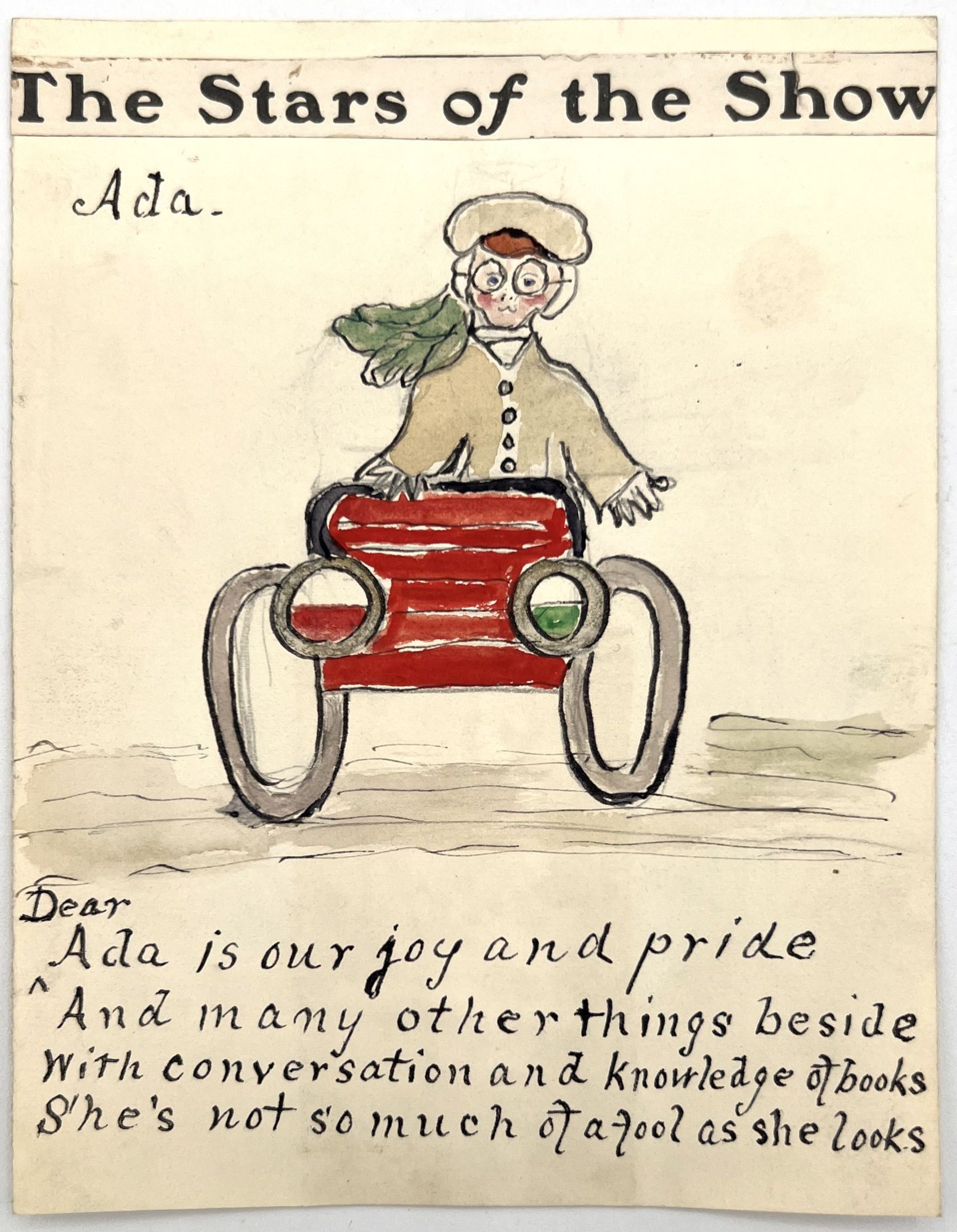 United States, 1920. Good to very good. Reinforced with card on back (perhaps used to be self-standing?). Light toning, staining/spotting.. A charming handmade card addressed in ink to "Ada" featuring a drawing of a red-haired girl in a motorcar, with a magazine clipping that reads "The Stars of the Show". The handwritten message below reads: Dear Ada is our joy and pride And many other things beside with conversation and knowledge of books She's not so much of a tool as she looks". Measures approx. 6.25" by 5