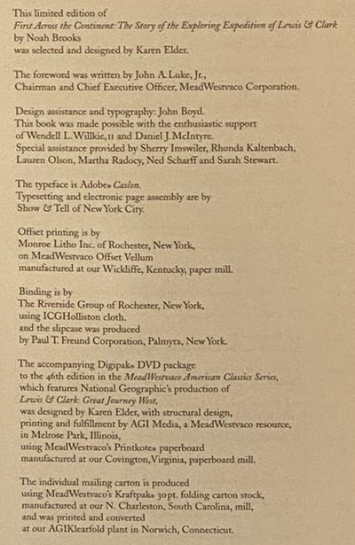 Rochester, New York: MeadWestvaco / National Geographic, 2003. Limited Edition. Hard Cover. Fine/Fine. 10x6x1. Limited edition. Includes publisher's slipcase. An exceptional copy. 2003 Hard Cover. 346 pp. 8vo. An augmented edition of the work originally published in 1901, including a DVD narrated by Jeff Bridges.An account of one of the most important exploring expeditions in American history, the Lewis and Clark Expedition (A.K.A. the Corps of Discovery Expedition). Brooks details the progress of Meriwether Lewis and William Clark from Pittsburgh, Pennsylvania, through the Continental Divide, and terminating at the Pacific Coast. They passed through a great deal of the newly acquired Louisiana Purchase, mapping the area as they went, and established a practical route to the western half of the continent that allowed the westward expansion of the United States to outpace the ambitions of Great Britain and other imperial powers.