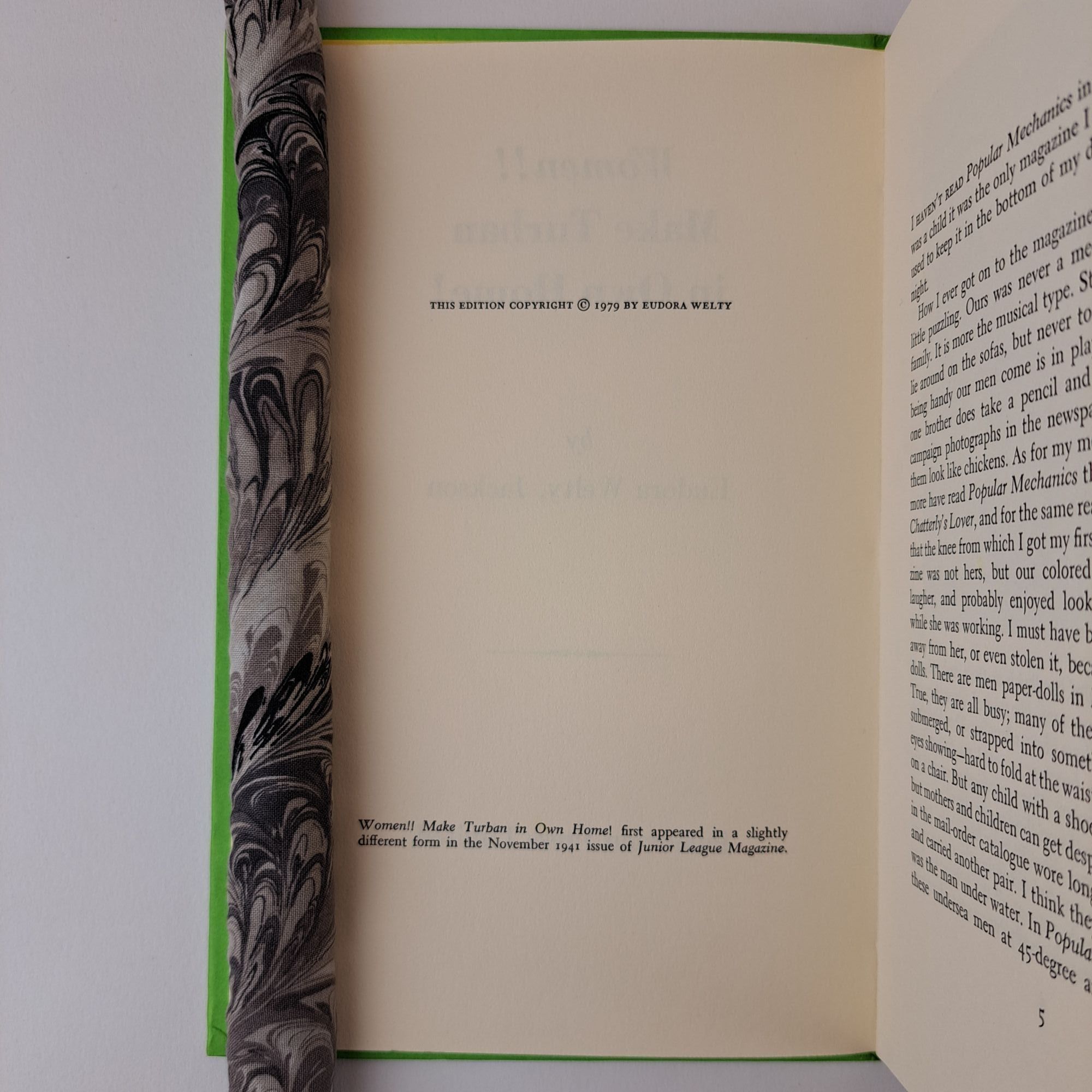 Jackson, MS: Palaemon Press Limited, 1979. First Limited Edition #73/235. Hardcover. Octavo, 13, [1] pages. In Very Good condition. Green boards with black lettering along the front board. Boards have mild shelving wear, and mild age-toning along the extremities. Textblock has mild age-toning along the edges. Signed flat by Eudora Welty on the publisher's limitation page, limited edition #73/235. Shelved Room C. 1394146. Special Collections.