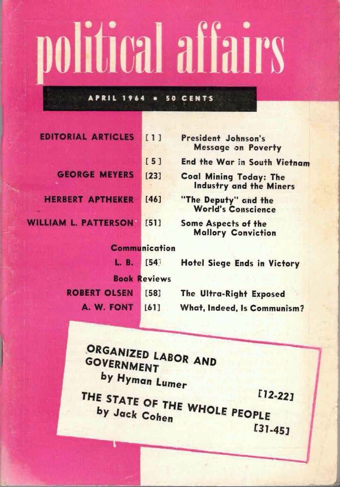 New York: New Century Publishers, 1964. Paperback. Very good. Paperback. 64pp. Rubbed and edgeworn, else very good in publisher's stapled wraps. "President Johnson's Message on Poverty" and "End the War in South Vietnam" Editorials, "Organized Labor and Government" by Hyman Lumer, "Coal Mining Today: The Industry and the Miners" by George Meyers, "The State of the Whole People" by Jack Cohen, "'The Deputy' and the World's Conscience" by Herbert Aptheker, "Some Aspects of the Mallory Conviction" by William L. Patterson, "Hotel Seige Ends in Victory" by L. B., "The Ultra-Right Exposed" by Robert Olsen, "What, Indeed, is Communism?" by A. W. Front.