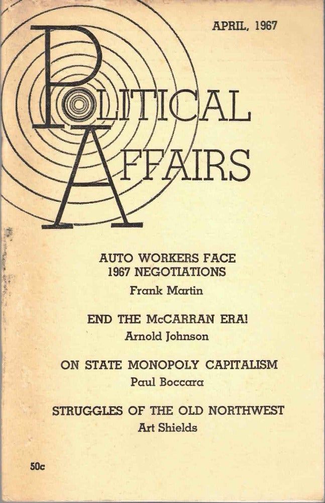 New York: New Century Publishers, 1967. Paperback. Very good. Paperback. 65pp. Rubbed and edgeworn, else very good in publisher's stapled wraps. "Auto Workers Face 1967 Negotiations" by Frank Martin, "End the McCarran Era!" by Arnold Johnson, "On State Monopoly Capitalism" by Paul Boccara, "Struggles of the Old Northwest" by Art Shields.