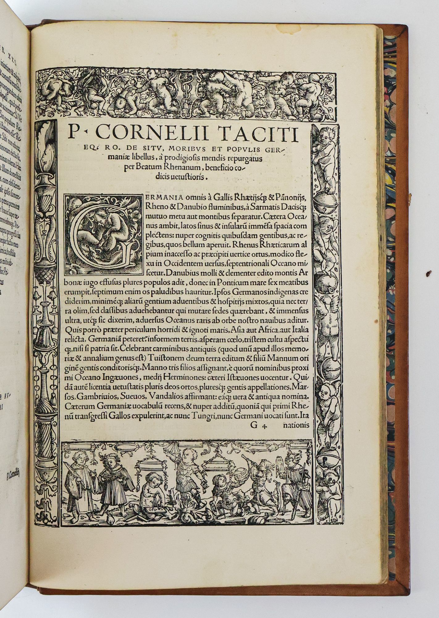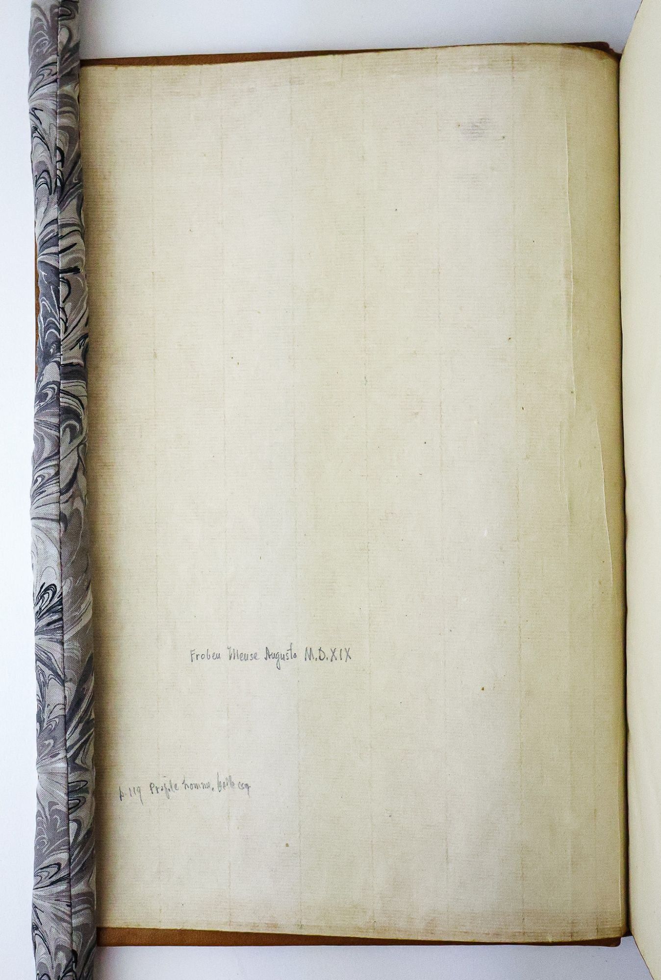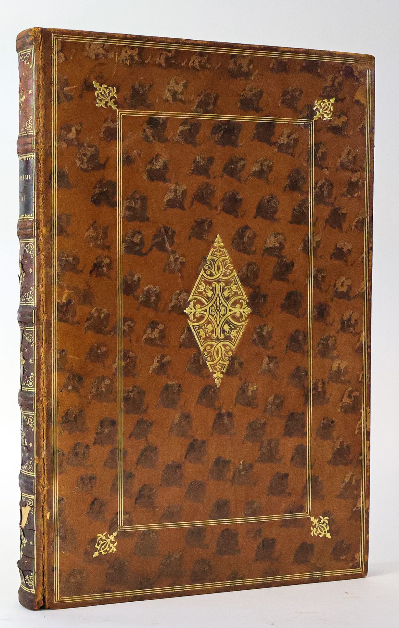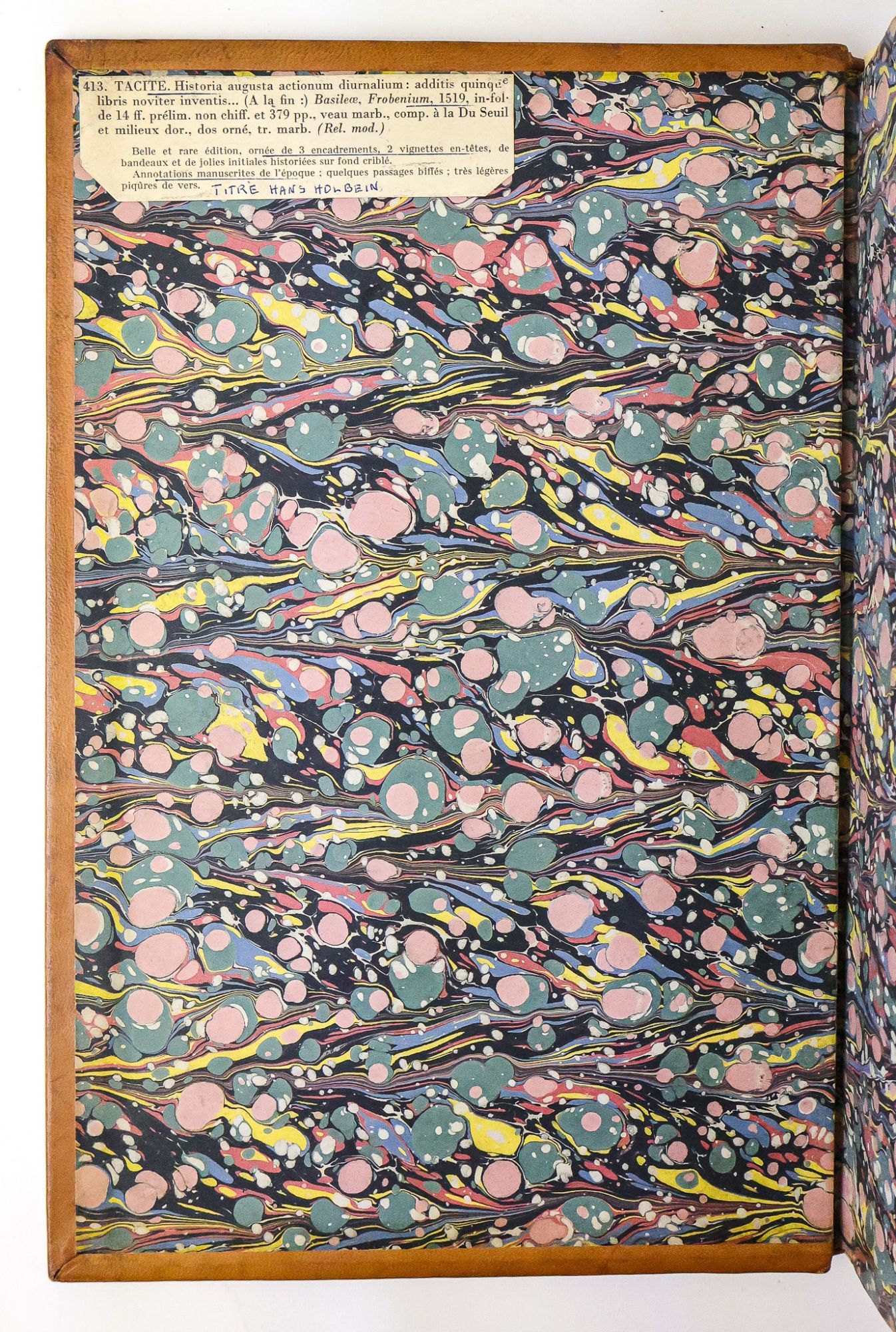 Basel: Ex officina Io. Froben [Johann Froben], 1519. Hardcover. Sexto, [28], 379, [1] pages. In Good minus condition. Bound in full brown calf with gilt ornamentation to spine and boards, and with label bearing gilt titling to spine. Cracking to both joints; light plus wear and bumping to edges and corners of boards and light wear to surfaces of boards. Moderate cracking of leather on spine. Text block lightly age toned with light foxing. Marbled endpapers with catalogue extract pasted to front free endpaper pencil annotations to endpapers; third blank front endpaper with slip bearing a name in ink pasted to page. Fourth front free endpaper with several early ink annotations; page with extensive archival repairs to damaged edges. Ink annotations to title page and throughout text block, with annotations in several hands, several colors of ink, and in pencil. Text in Latin. USTC: 681873.