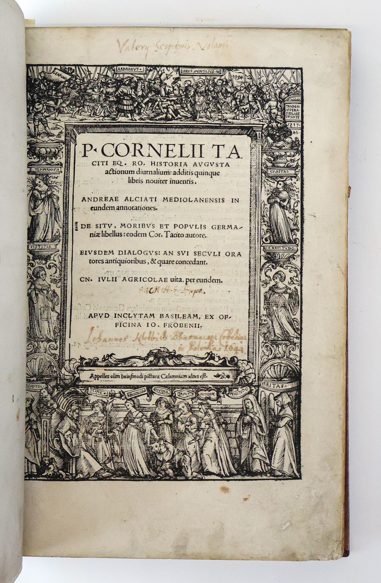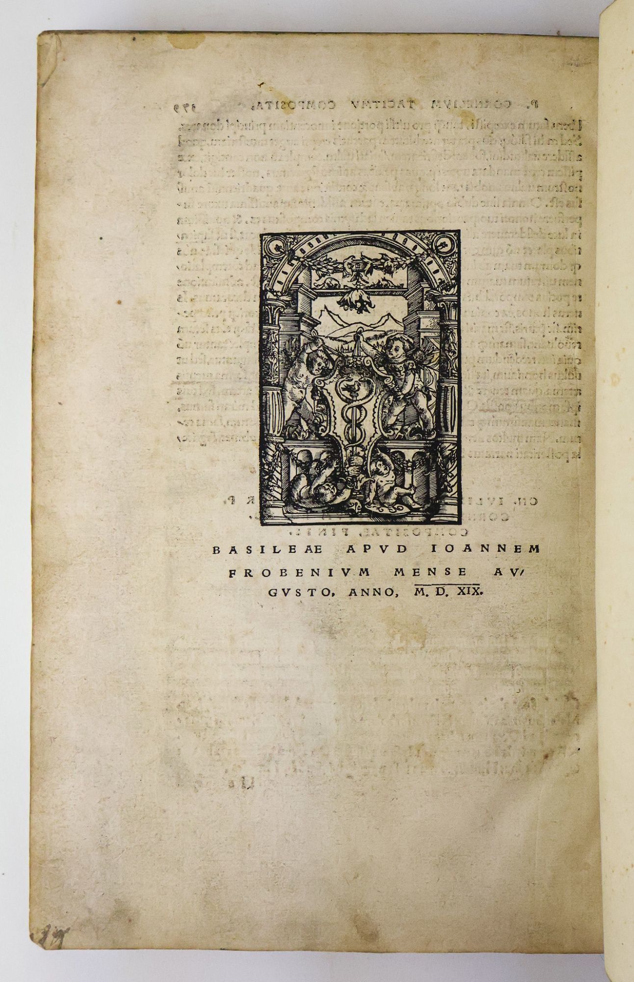 [Oversized book. Additional postage necessary for expedited/international orders. Economy International shipping unavailable due to size/weight restrictions. For international/expedited customers, please inquire for rates.] BW Consignment. Shelved in Room A Oversized. Johann Froben (c. 1460-1527) was a humanist printer and scholar. Together with his son, Hieronymus, and son-in-law, Nikolaus Episcopius, he established Basel as a significant hub of the European book trade. The Froben firm published many works by Erasmus, who was a friend of Johann. They also collaborated regularly with Hans Holbein the Younger, who designed a printer's device for the Froben firm (the Hermes caduceus printed on the title page of this work), as well as the elaborate engraved border on this work's title page. 1394195. Special Collections.