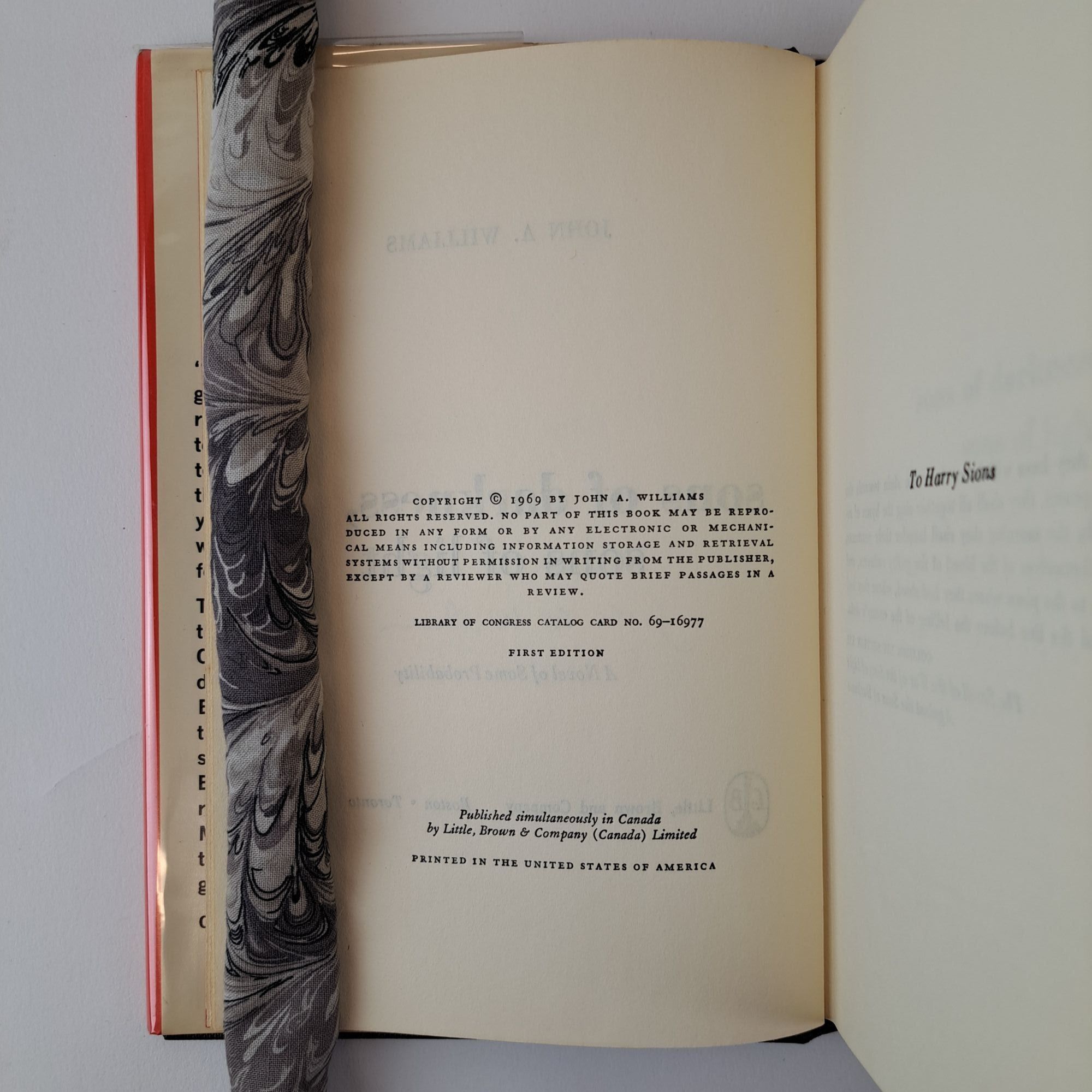 Boston, MA: Little Brown and Company, 1969. First Edition, First Printing. Hardcover. Octavo, 279 pages. In Very Good minus condition with a Very Good condition dust jacket. Red spine with black lettering. Dust jacket is wrapped in a mylar covering, price uncut "$5.95", has light chipping along the spine and fore edges, a tear along the spine head edge, and light stains. Boards have mild shelving wear. Textblock has light soiling 279, and mild to moderate foxing along the fore and head edges. Signed flat by John A. Williams on the title page. Shelved in Room C. 1394203. Special Collections.
