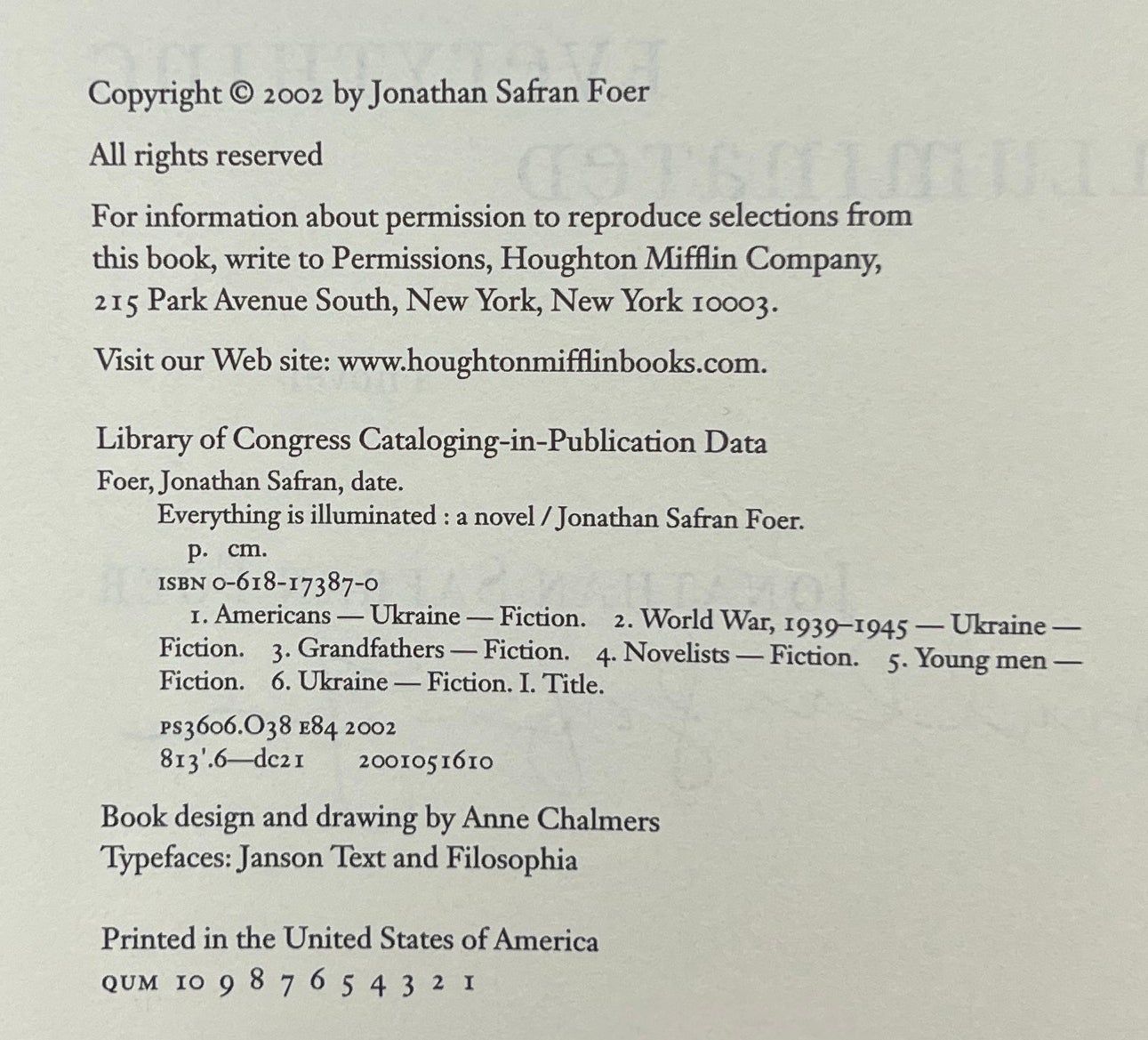 Boston: Houghton Mifflin, 2002. First Edition. Hardcover. Fine/Fine. Inscribed by Foer on the title page. Fine in a Fine jacket, unclipped ($24.00). Black boards with white ink lettering on the spine. Square and firmly bound, clean internally. A quixotic adventure to find a woman who might have saved the protagonist's grandfather from Nazis, adapted into the 2015 film of the same title starring Elijah Wood.