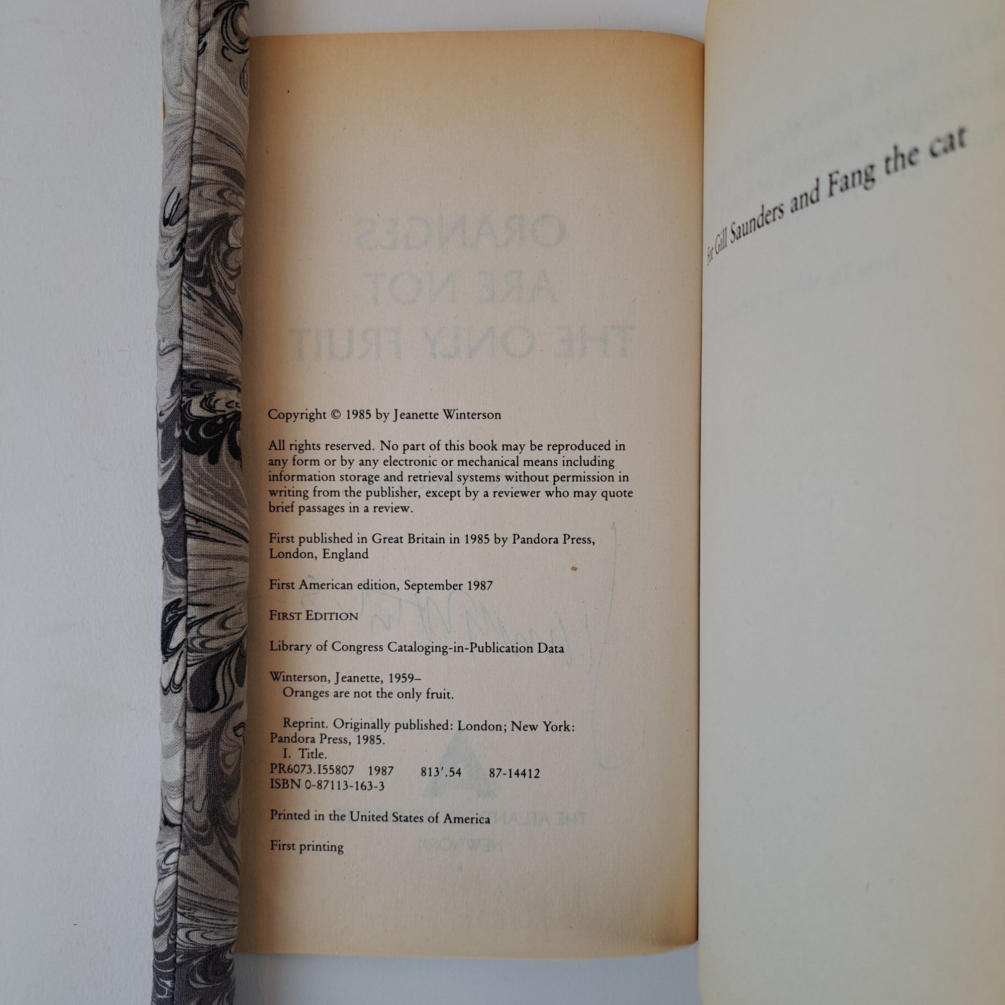 New York, NY: Atlantic Monthly Press, 1987. First American Edition, First Printing. Softcover. Octavo, 176 pages. In Very Good condition. Green spine with orange and red lettering. Covers have creasing along the spine, mild rubbing wear along the edges, and mild age toning. Textblock has stains on the rear of the contents page to page 2, and moderate to severe age toning along the edges. Signed flat by Jeanette Winterson on the title page. Shelved in Room C. 1394251. Special Collections.
