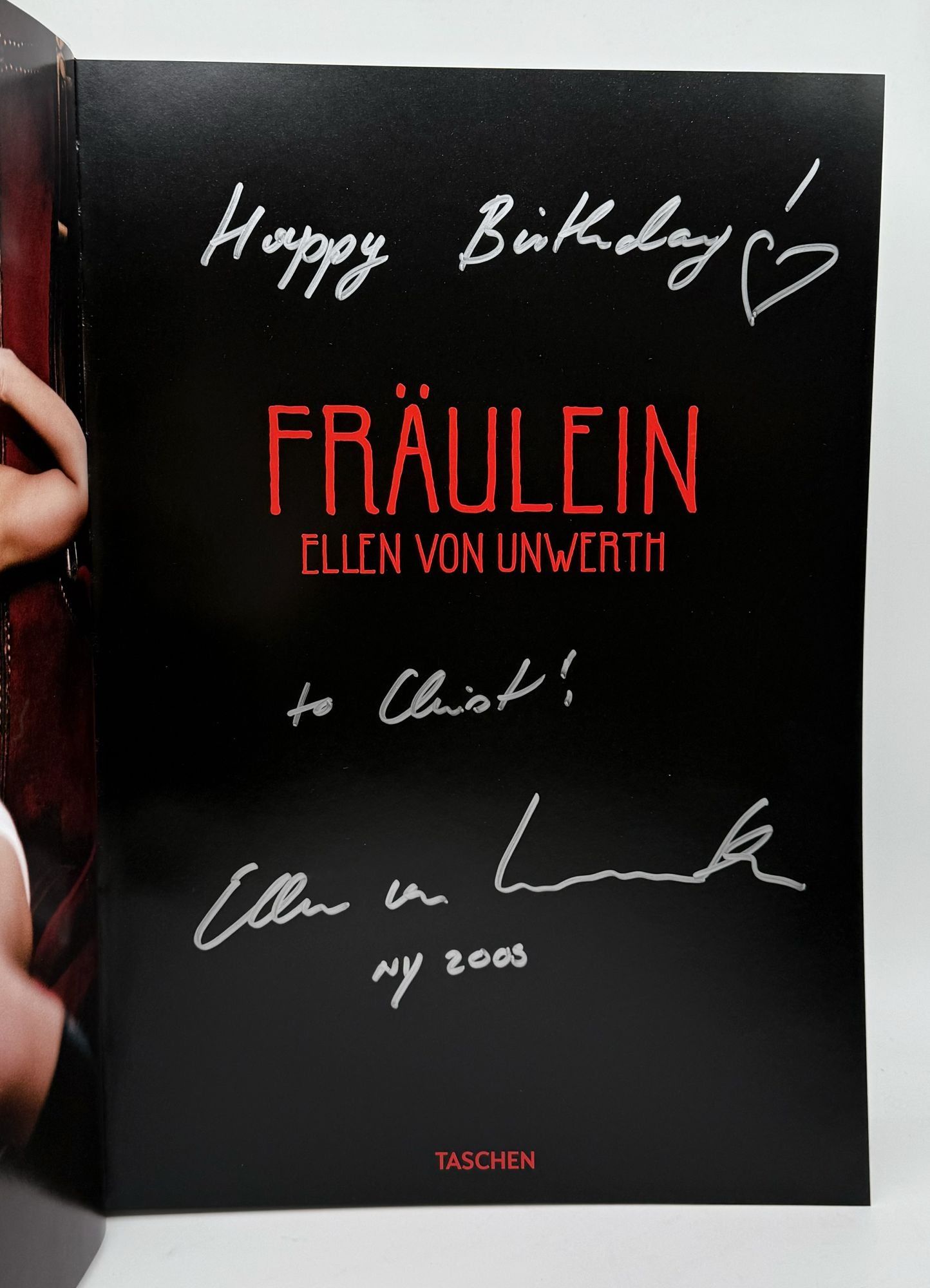 Cologne: Taschen, 2009. First edition, Collector's edition, number 546 of 1,500 numbered copies (nos. 201–1,700), signed by the photographer. 482 pp. Elephant Folio. Half simulated lizard-skin leather spine and printed paper covered boards. Near Fine in matching drop box, which is a bit shaken from the size of the production. First edition, Collector's edition, number 546 of 1,500 numbered copies (nos. 201–1,700), signed by the photographer. 482 pp. Elephant Folio. Inscribed by Ellen von Unwerth to Christ Zois, with a Happy Birthday! exclamation in New York 2003. Zois is a screenwriter, famous for his collaborations with Abel Ferrara.