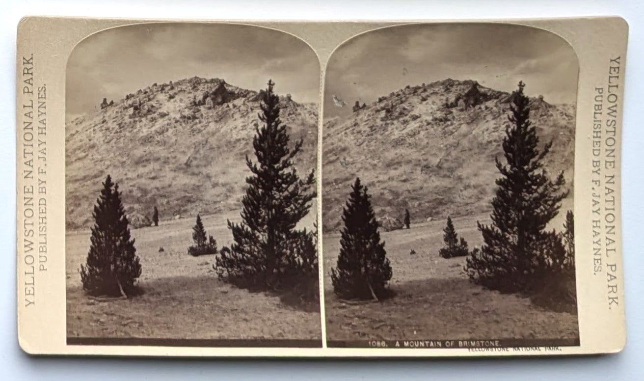 Fargo, D.T. [Dakota Territory]: F. Jay Haynes, 1884. [1000 Series]. Photograph. Very Good. Stereoview photograph on a tan Yellowstone National Park mount [10 cm x 18 cm]. Yellowstone National Park backstamp. Title is in a black and white stripe along the bottom edge of the right image. A bit of scuffing and rubbing. Good contrast, a sharply focused print. Shows the mountain referenced in the title foregrounded with three dark pines.