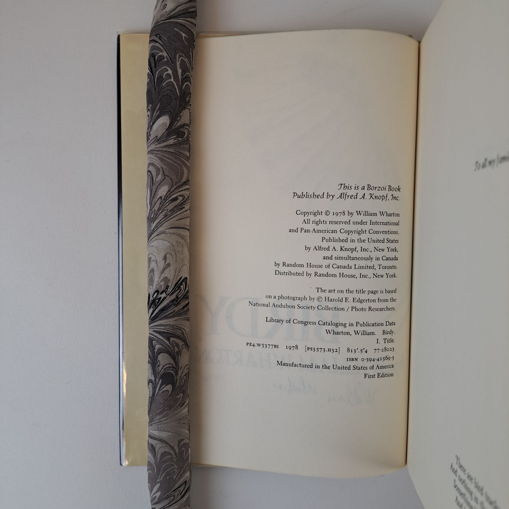 New York, NY: Alfred A. Knopf, 1979. First Edition, First Printing. Hardcover. Octavo, 309 pages. In Very Good minus condition with a Very Good condition dust jacket. Black spine with orange and white lettering. Dust jacket is wrapped in a mylar covering, price is uncut "$8.95", has mild shelving wear, and moderate age-toning throughout. Boards have mild wear along the head and tail edges, moderate age-toning along the head and tail edges, and small stains along the spine. Textblock front pastedown is misaligned, has mild wear along the edges, two remainder marks on the tail edges, and light foxing along the head edges. Signed flat by William Wharton on the title page. Shelved Room C. 1394277. Special Collections.