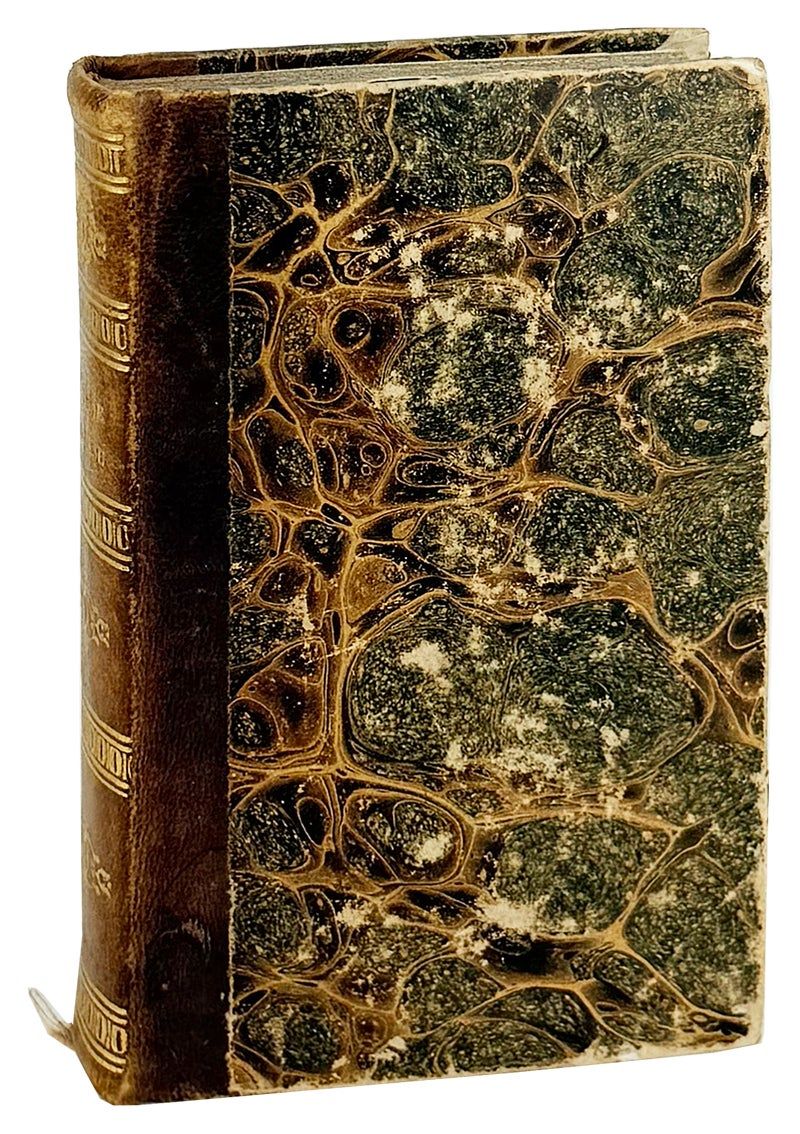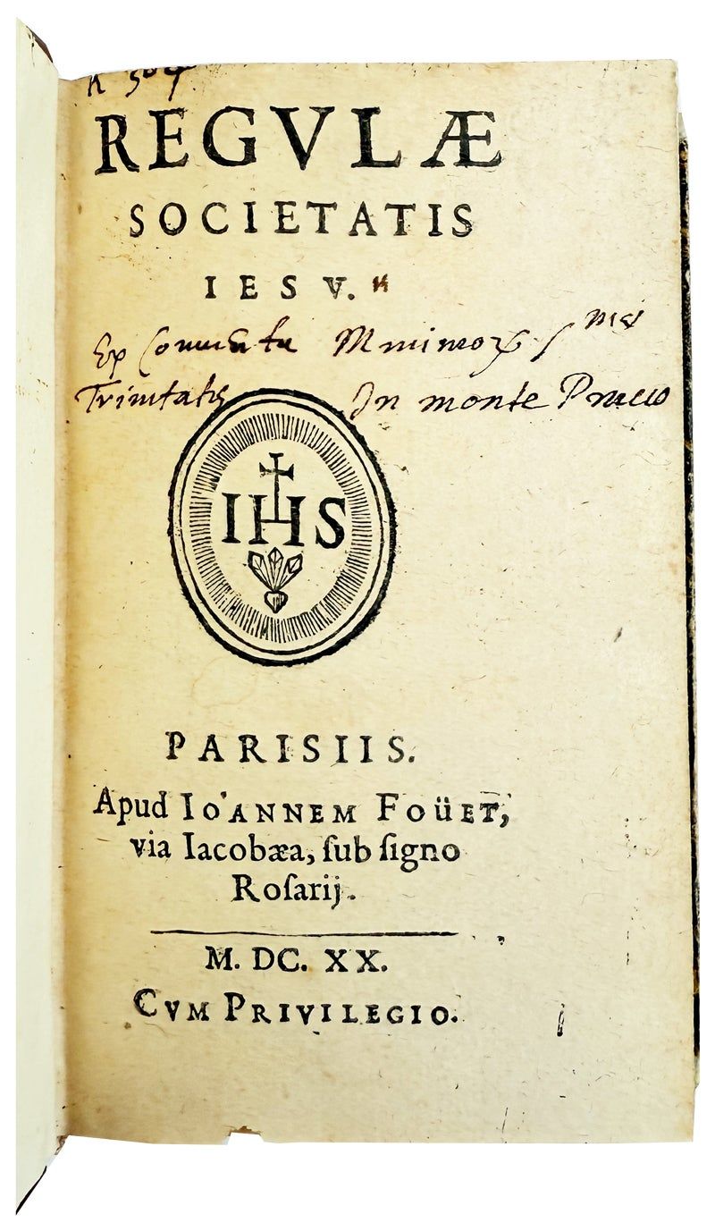 Parisiis [Paris]: Apud Ioannem Fouet via Iacobaea, sub signo Rosarij, 1620. Very Good. Parisiis [Paris]: Apud Ioannem Fouet via Iacobaea, sub signo Rosarij, 1620. Early reprint. 12mo. [5]; 2-359; [360] misprinted 36; [4]pp. Jesuit symbol to title page; initial engravings. Later (19th century?) quarter morocco over marbled paper-covered boards with spine stamped in gilt; edges sprayed; reading ribbon; trimmed with text unaffected; new endpapers. Light wear to edges and rubbing to spine. Binding sound. Bookplate in manuscript to front pastedown; contemporary inscription to title; else unmarked. A Very Good copy of this early reprint of the Rules of the Society of Jesus.