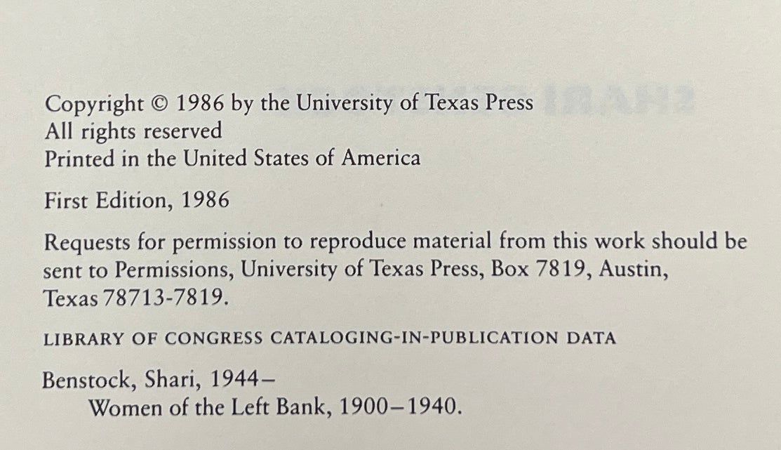 Austin: University of Texas Press, 1986. First Edition. Hardcover. Near Fine/Good. Near Fine in a Good jacket, unclipped (no price), faded at the spine, generally worn and rubbed, a few short tears and chips at the edges. Black cloth with gilt lettering on the spine. Square and firmly bound, lightly soiled at the edges, clean internally. Benstock's literary examination of two dozen women who left their marks on the literary world, like Djuna Barnes, Sylvia Beach, Kay Boyle, H.D., Janet Flanner, Anais Nin, Gertrude Stein, among others.