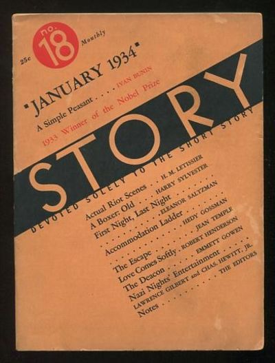 New York: Story Magazine, Inc.. Very Good. 1934. (Vol. IV; whole No. 18). Magazine. [a good sound copy, modest external wear and light soiling to covers; binding fully intact] Contains the following stories: "Actual Riot Scenes" (H.M. LeTissier); "Accommodation Ladder" (Hedy Verena Gossman); "A Boxer: Old" (Harry Sylvester); "Love Comes Softly" (Robert Henderson); "The Deacon" (Emmett Gowen); "The Escape" (Jean Temple); "Nazi Nights' Entertainment" (Lawrence Gilbert and Charles E. Hewitt, Jr.); "First Night, Last Night" (Eleanor Saltzman); "A Simple Peasant" (Bunin). The magazine's "Notes" section includes quite a bit of information about Bunin, who had just been awarded the 1933 Nobel Prize for Literature. (Quite interesting is the "Nazi Nights' Entertainment" story. Written in a kind of faux-Ring Lardner/Damon Runyon idiom, its American narrator tells about running into a Brown Shirt acquaintance in Berlin one night and accompanying him to a beer-hall gathering of similiar types, where there ensues (amidst the general revelry) a discussion about various topics related to the "New Germany," including the concentration camps, "where the Brownies put away all the Reds and the Jews and their business rivals and all the other mugs they don't want to have around." For a little context, Hitler and the Nazis had only been in power for one year at the time.) .