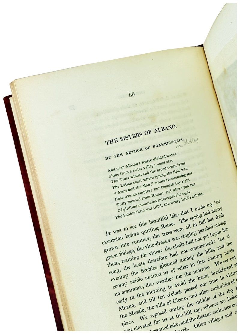 Magnificent example of this scarce keepsake volume with contributions by Sir Walter Scott, Wordsworth, Coleridge, Percy Bysshe Shelley, and Mary Shelley, listed here simply as "the author of Frankenstein." The short story appears on p. 80 under the title "The Sisters of Albano," adorned with an accompanying engraving. As with her masterpiece "Frankenstein," Shelley returns to the nesting story within a story which opens with a pleasure party on the banks of Lake Albano observing a young couple, a young worker with a rifle and his female companion. Thus sets off this tragic examination of "the mingling of love with crime," the story of sisters Maria and Anina, the elder a devout nun, the younger an adolescent who commits a crime for love that lands her before the executioner. In an act of desperation the sisters exchange garbs when Maria comes to visit Anina in order to save her but tragedy comes for all the characters in the end.