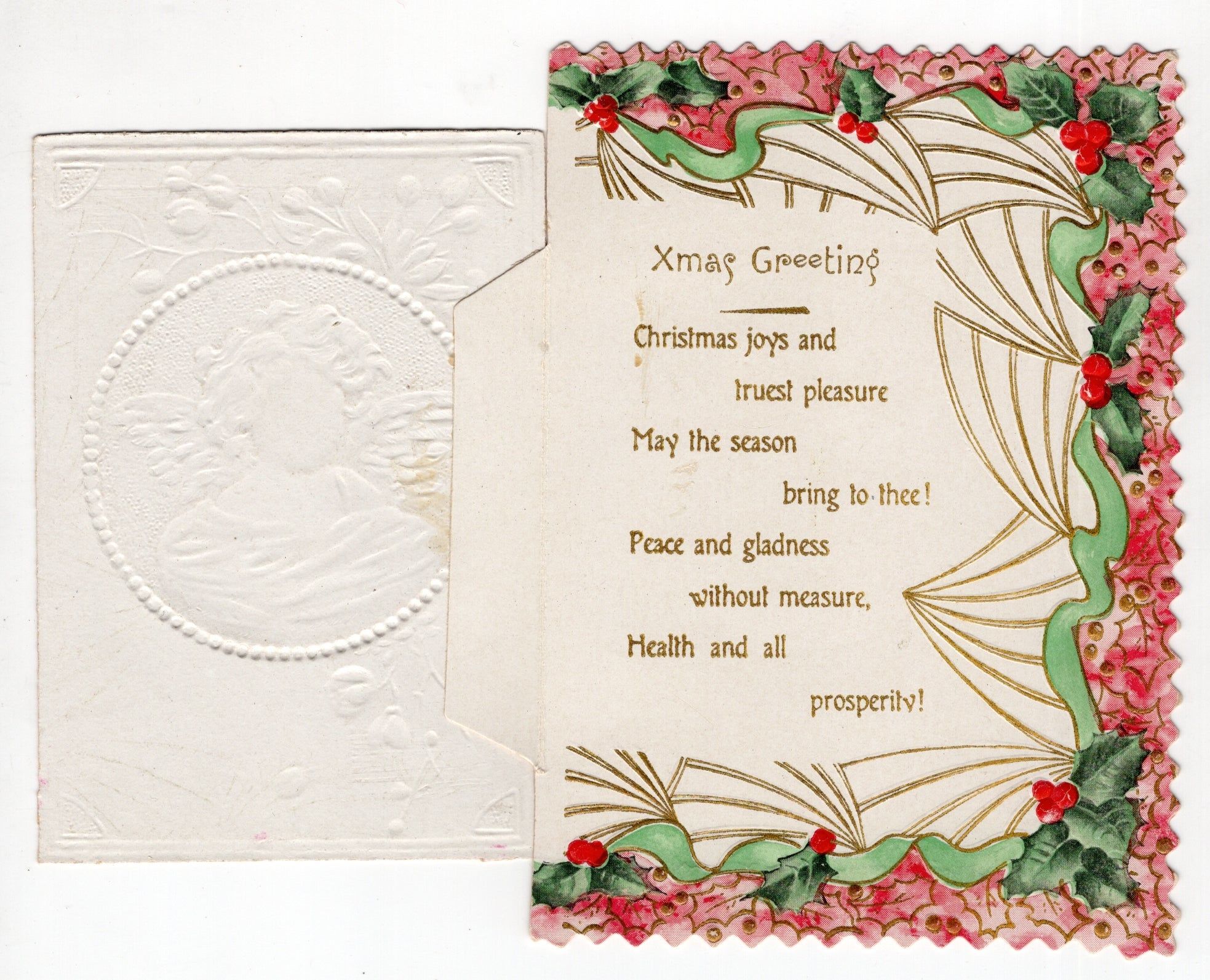 United Kingdom, 1890. Very good. Toned with short tear to fold.. An attractive gilt and embossed Christmas greeting card, made from two embossed and gilt chromolithographed cards bonded together at the left-hand edge. When the upper card is lifted, a message is revealed that reads, "Christmas joys and truest pleasure May the season bring to thee! Peace and gladness without measure, Health and all prosperity!". Measures approx. 4.75" by 3.5". Depicts winged putti on front.