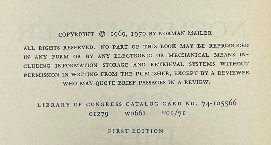 Boston: Little, Brown & Co, 1970. First Edition. Hardcover. Fine/Fine. Signed by Mailer on the second front endpaper. Fine in a Fine jacket, unclipped ($7.95). Brown cloth with gilt lettering on the spine. Square and firmly bound, clean internally. Mailer's meditation on NASA and space exploration in the wake of the Apollo 11 mission.