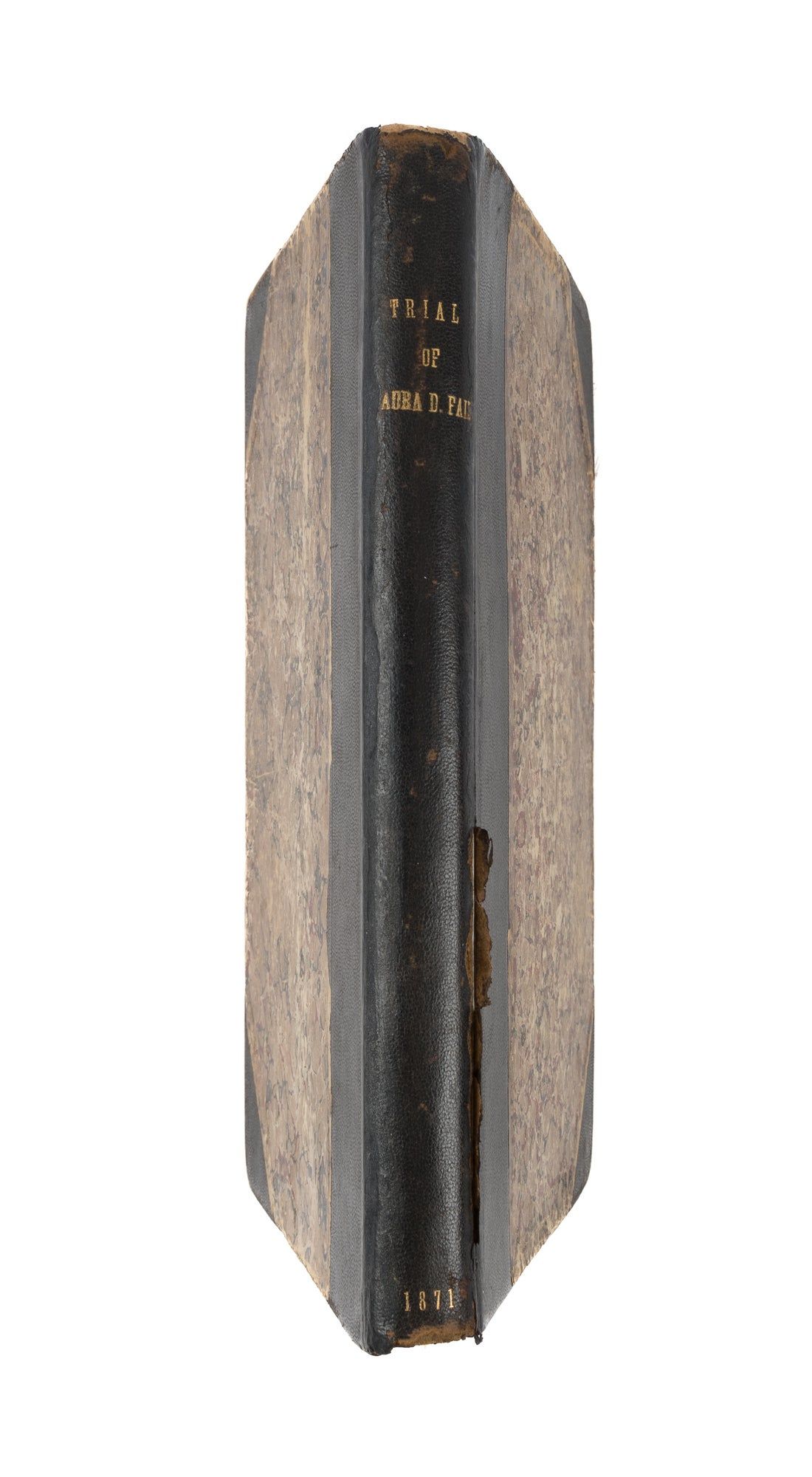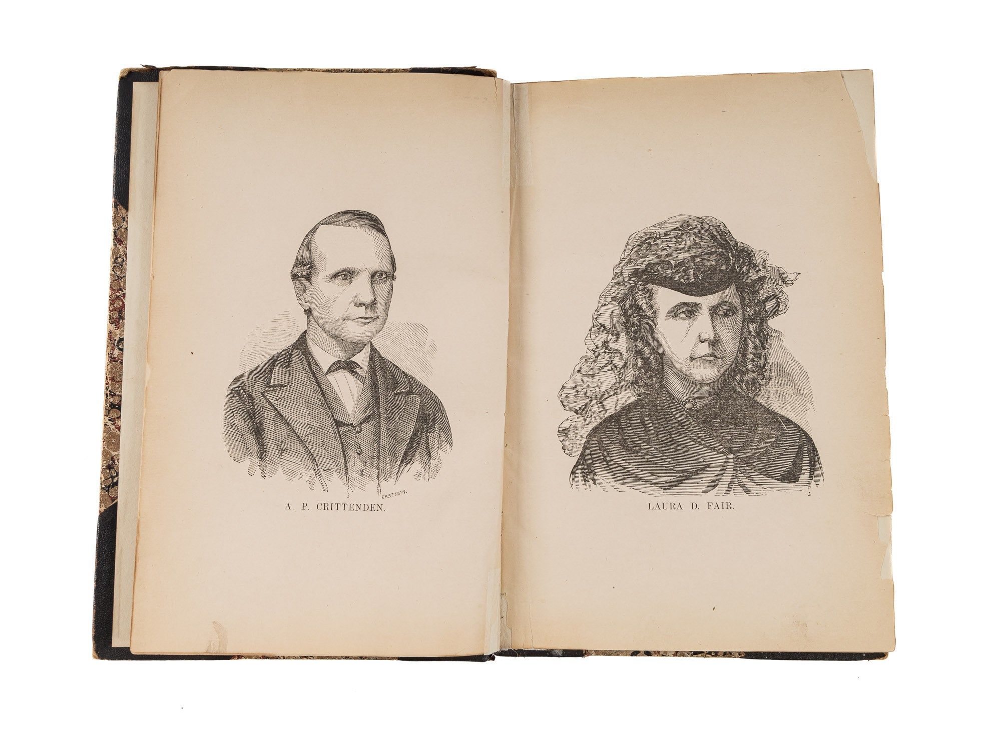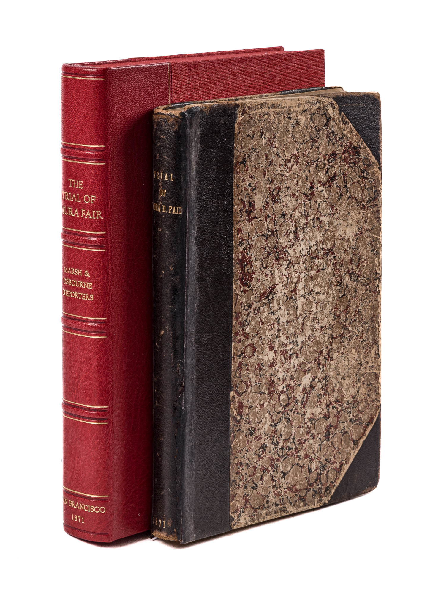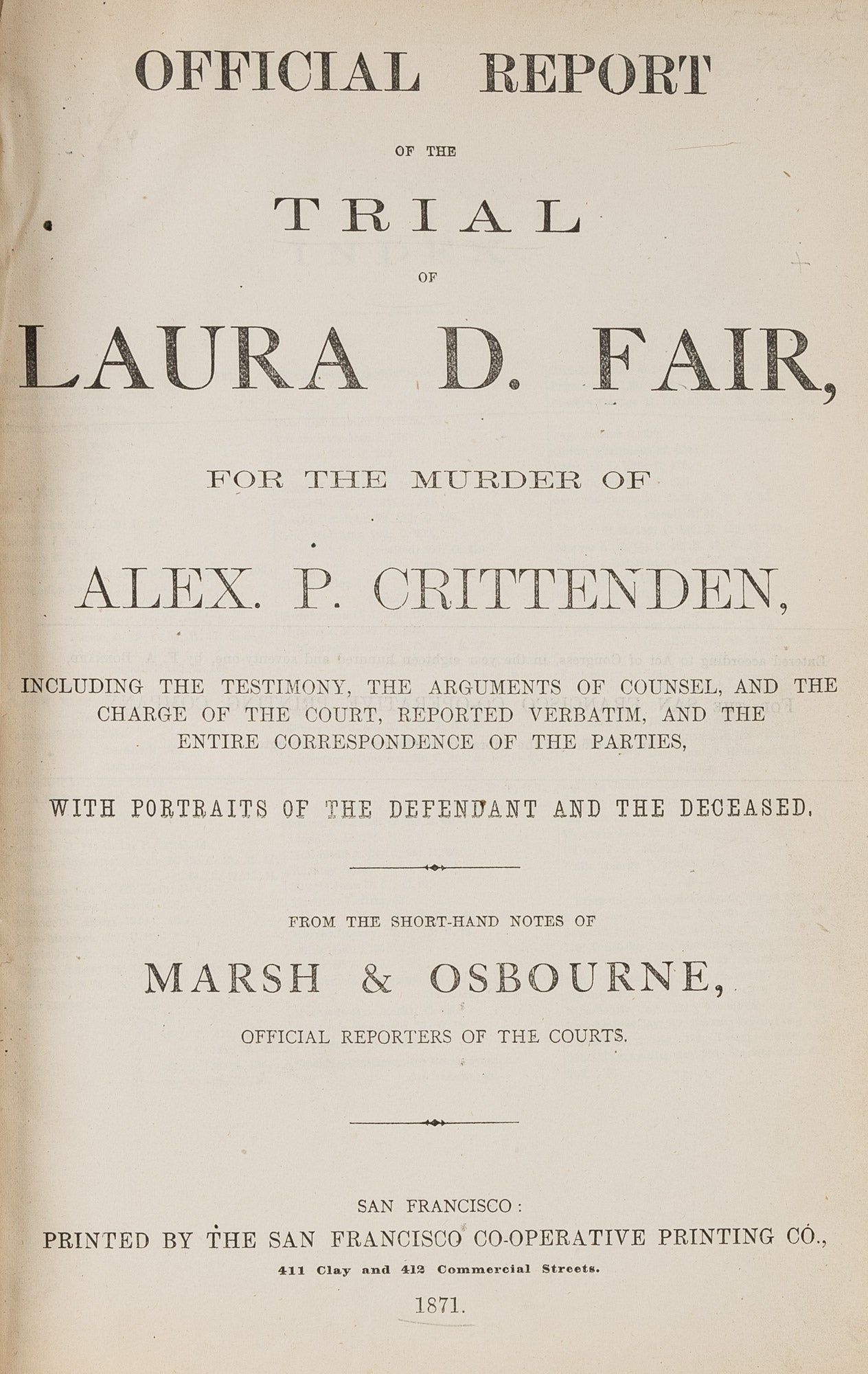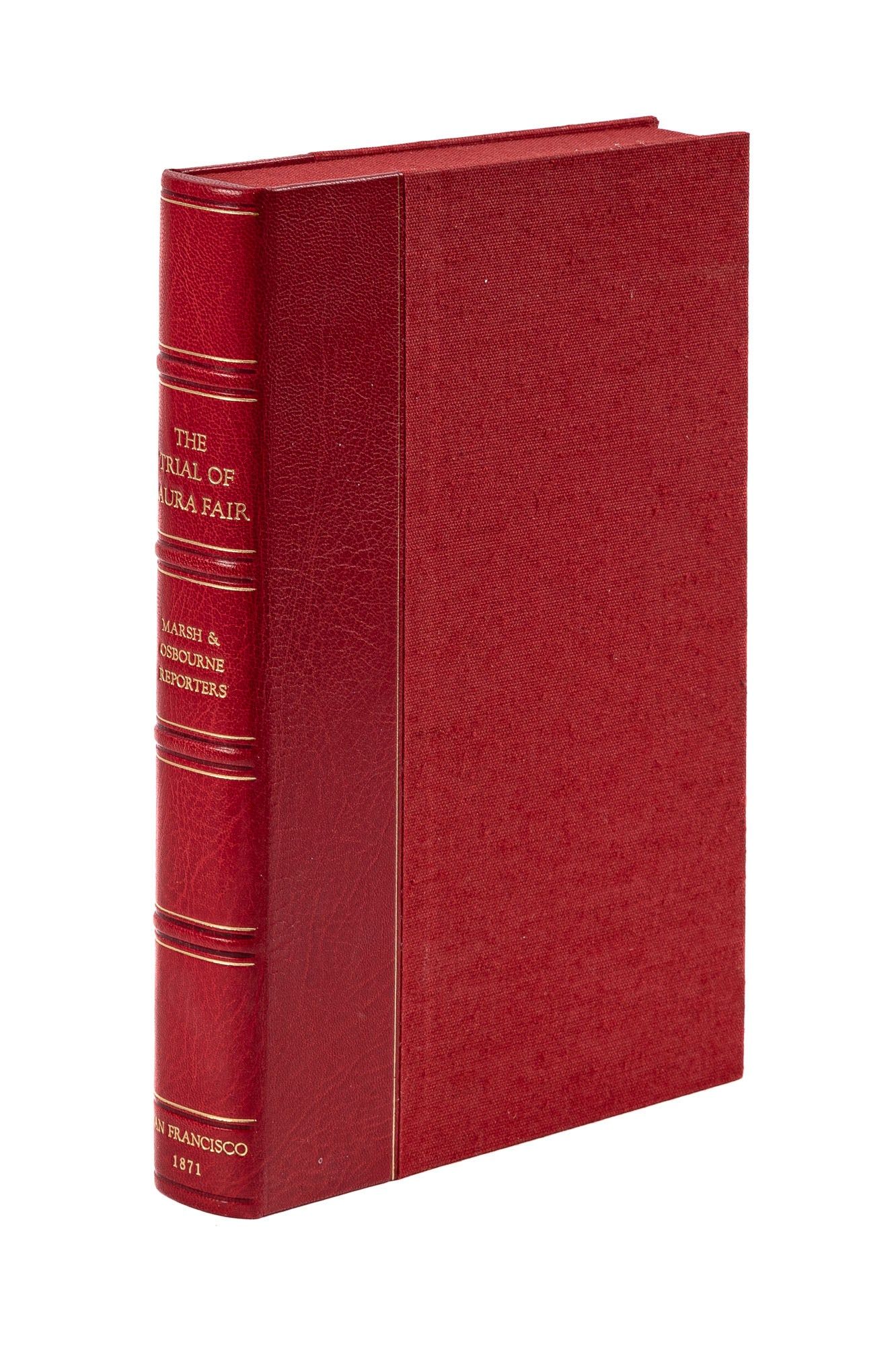1871. San Francisco, 1871. Only edition. San Francisco, 1871. Only edition. McDade 291: Driven Insane by Her Menstrual Cycle? [Trial]. Fair, Laura D., Defendant. Marsh, [Andrew Jackson], Reporter. Osbourne, [Samuel], Reporter. Official Report of the Trial of Laura D. Fair, For the Murder of Alex. P. Crittenden: Including the Testimony, The Arguments of Counsel, And the Charge of the Court, Reported Verbatim, And the Entire Correspondence of the Parties, With Portraits of the Defendant and the Deceased. From the Short-Hand Notes of Marsh & Osbourne, Official Reporters of the Courts. San Francisco: Printed by the San Francisco Co-Operative Printing Co., 1871. 4, 325, xvii pp. With two full-page woodcut portraits of Fair and Crittenden as a double frontispiece. Octavo (9-3/4" x 6-1/2"; 24.8 x 16.5 cm). Stab-stitched book bound in later (twentieth-century?) three-quarter sheep over marbled boards, gilt title to spine. Rubbing, light wear to extremities, front joint starting, chipping to spine ends, corners bumped and worn, hinges cracked (front hinge reinforced with archival tissue), library bookplate (with deaccession stamp) to front pastedown. Moderate toning to interior, light edgewear and a few chips to portrait leaves, light foxing to last few leaves, tear to head of gutter of title page, internally clean. Housed in attractive custom crimson clamshell box, quarter morocco over cloth with raised bands and gilt title to spine. $1,500. * Only edition. When Laura Fair found out that the married lawyer who had courted her had no intention of actually leaving his wife, she shot him on the San Francisco ferry. The trial quickly became a national sensation, "calling into question fundamental assumptions about the sanctity of the family, the value of reputation, and the range of acceptable expressions of femininity" (Krist). The prosecution sought to paint Fair as a mercenary, promiscuous woman who seduced Crittenden for his money. The defense countered by arguing that Fair's painful menstrual cycles "and great prostration of the nervous system" had driven her insane. Fair's cause was taken up by local suffragists, who saw her as the victim of a legal system run by and prejudiced in favor of men. Despite their efforts, she was convicted and sentenced to hang. A second trial was ordered on appeal and resulted in acquittal. No copy of this title has appeared at auction in the last 45 years, and only three copi.