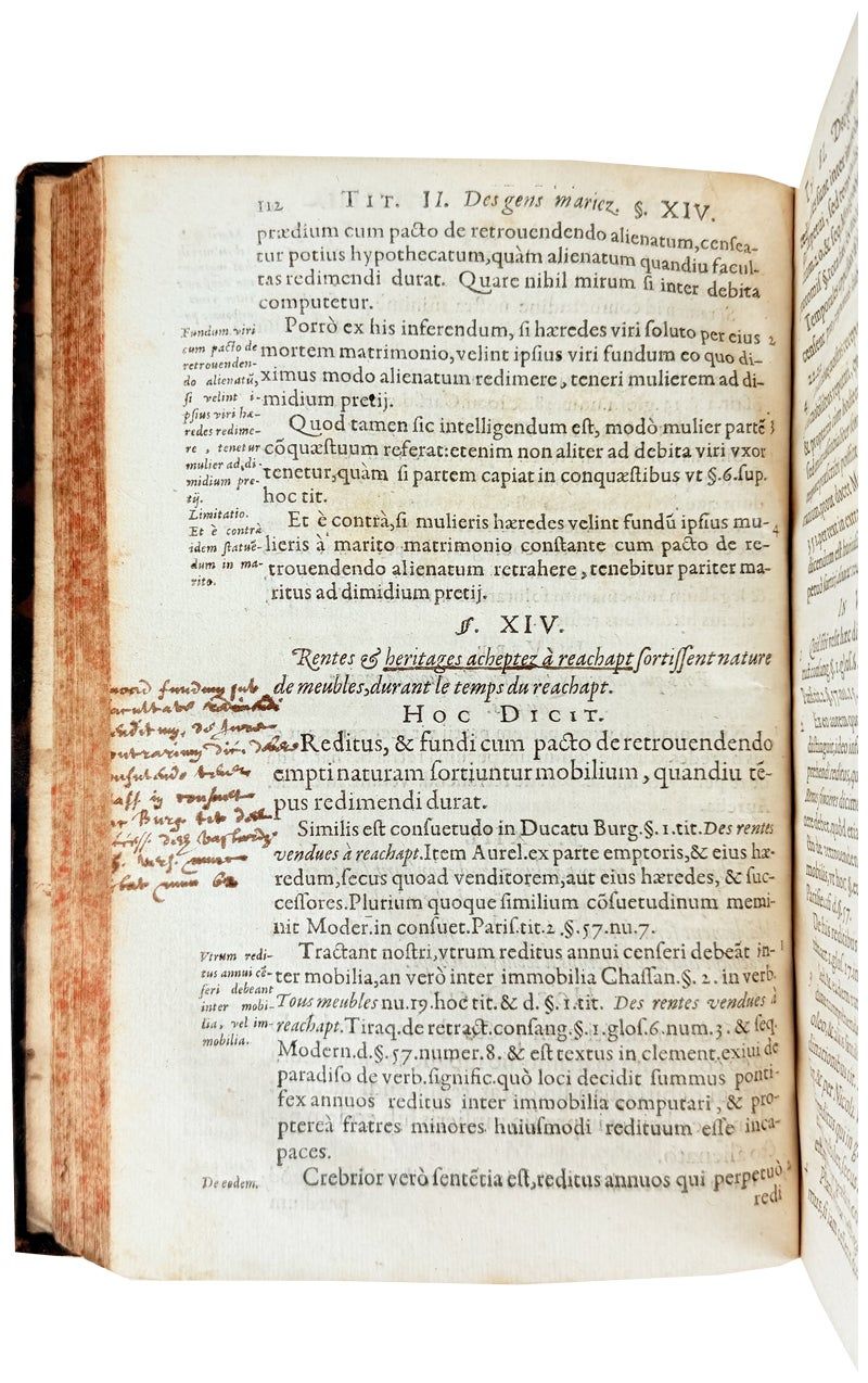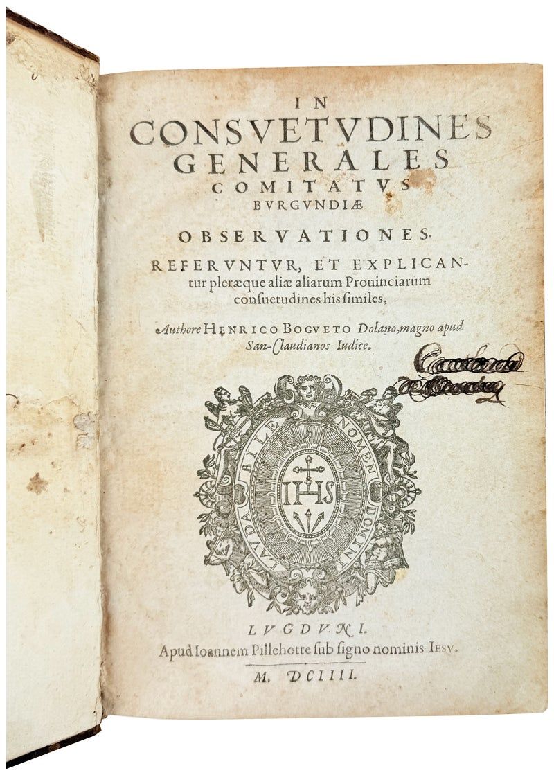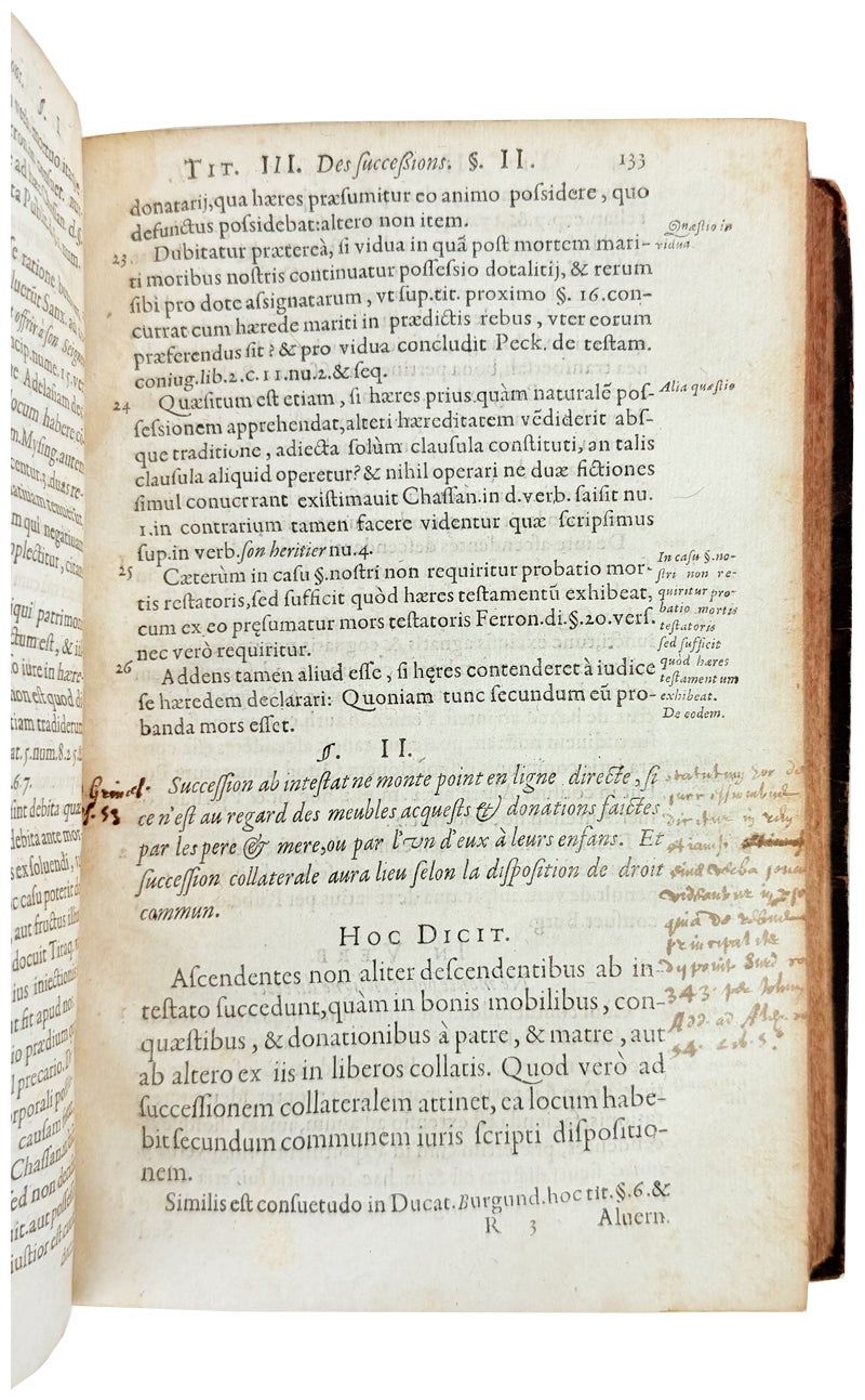 Substantial study of Burgundian customary laws by the local jurist Henry Boguet (1550-1619). Boguet rose to prominence two years earlier after the appearance of his oft-republished demonological treatise "Discours exécrable des Sorciers" (1602). The present work did not receive quite the same attention. While the majority of the text is in Latin, the section headers are usefully provided in French and these are the portions of the text which received the most attention by the contemporary owner. They took particular interest in sections on women's marriage rights and succession rights, perhaps in preparation for a marriage or in the wake of a parent's death perhaps.
