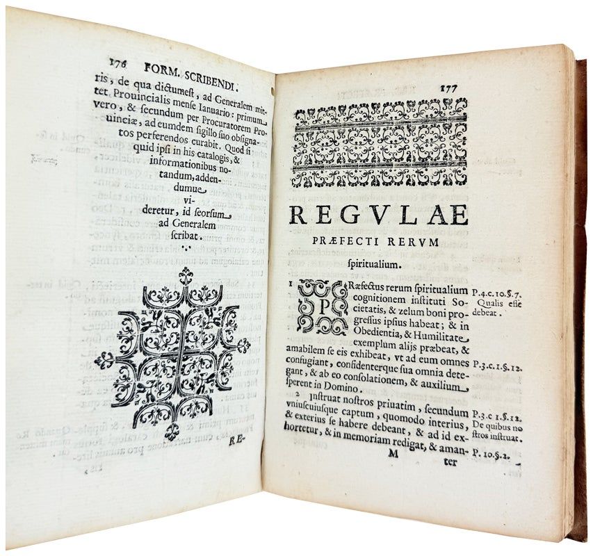Romae: In Collegio Romano eiusdem Societatis, 1616. Very Good. Romae: In Collegio Romano eiusdem Societatis, 1616. Small octavo; full contemporary limp vellum, faint manuscript spine titling; [48],298,[2]pp (collated complete); woodcut Jesuit device to title page, title page printed within elaborate woodcut border, typographically decorative initials, head- and tail-pieces throughout. Parchment darkened and a bit worn along margins, very faint evidence of previous ties only, faint green Jesuit seminary rubber-stamp to title page and early 20th-century manuscript shelf label to front pastedown, else a Very Good, internally clean and sound copy of this early edition of the Rules of the Society of Jesus.
