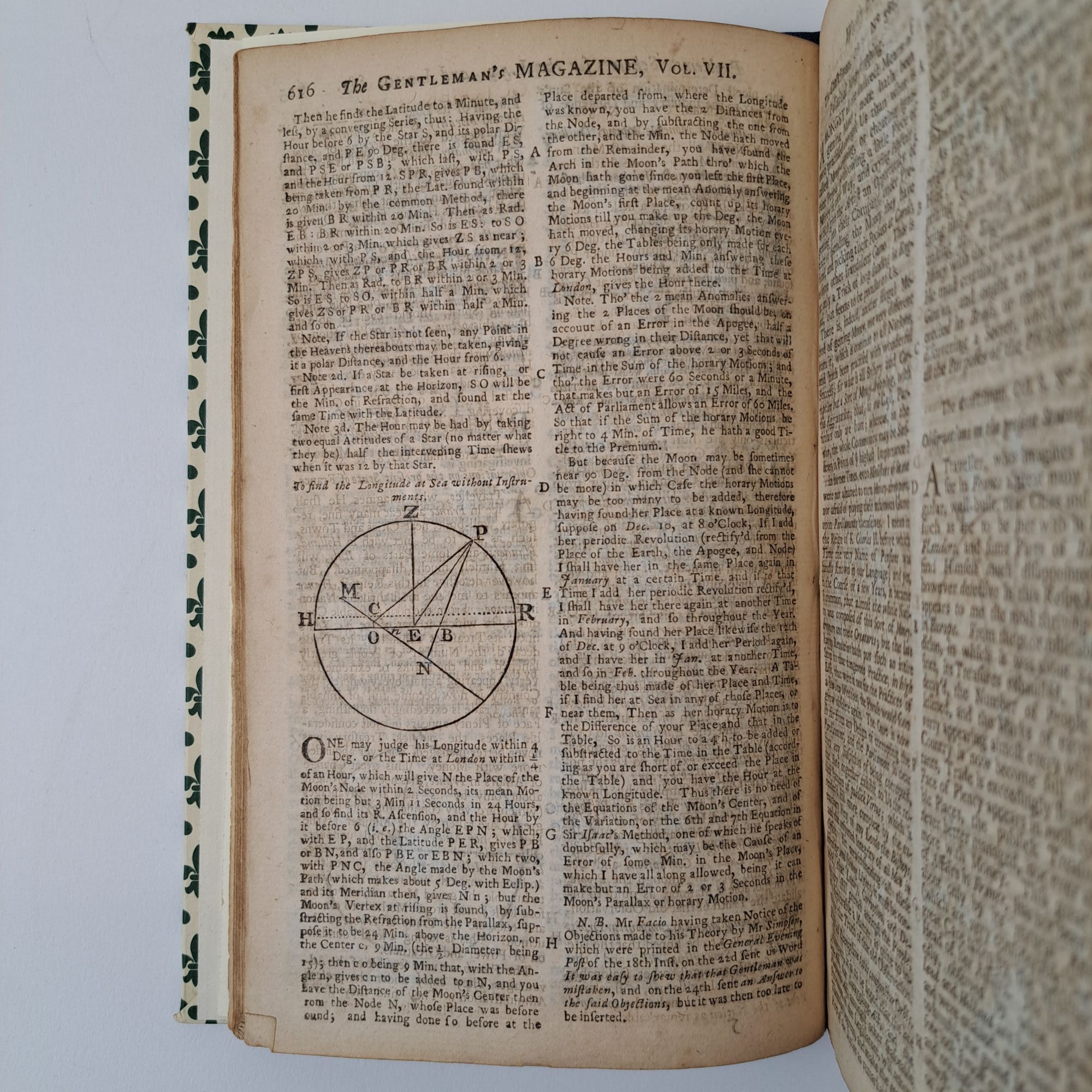 London: E. Cave, 1737. First Edition. Hardcover. Octavo, [579]-[642] pages. In Very Good condition Bound in 20th-century quarter blue cloth with unmarked spine and paper-covered boards. Corners of boards and head and tail of spine lightly bumped. Text block with light plus age toning, somewhat more significant at edges. Bookplate of a previous owner to front pastedown. BB Consignment. Shelved in Room A. Pages 611-616 include a submission from a N. Facio Duillier (probably Nicolas Fatio de Duillier) on accurately calculating the Sun's parallax - a key issue in solving the "Longitudinal Problem". The questions being sketch out here by Duillier were later published in an article for Miscellanea curiosa mathematica (vol. II, no. 1; 1745) entitled: "Four theorems, with their demonstration, for determining accurately the sun's parallax". De Duillier published previously on the same question in the July 1737 issue of The Gentleman's Magazine. 1394681. Special Collections.