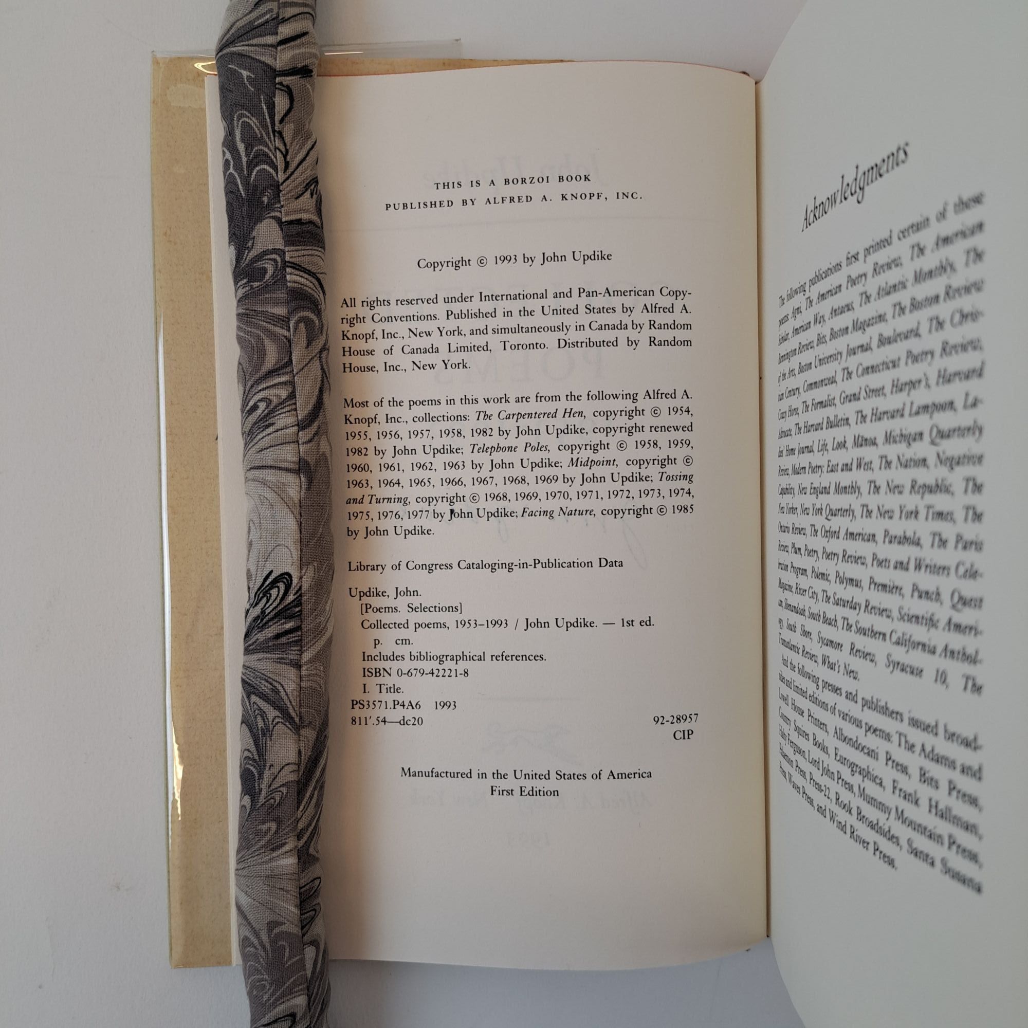 New York, NY: Alfred A. Knopf, 1993. First Edition, First Printing. Hardcover. Octavo, xxiv, 387 pages. In Very Good condition with a Very Good condition dust jacket. Greenish/tan spine with black and light gray lettering. Dust jacket is wrapped in a mylar covering, price uncut "U.S.A. $27.50/Canada $36.00", has general shelving wear. Boards have mild age toning along the edges, and bending wear along the spine head/tail. Textblock has light soiling on page 130, and light foxing along the tail edges. Signed flat by John Updike on the title page. Shelved in Room C. 1394687. Special Collections.