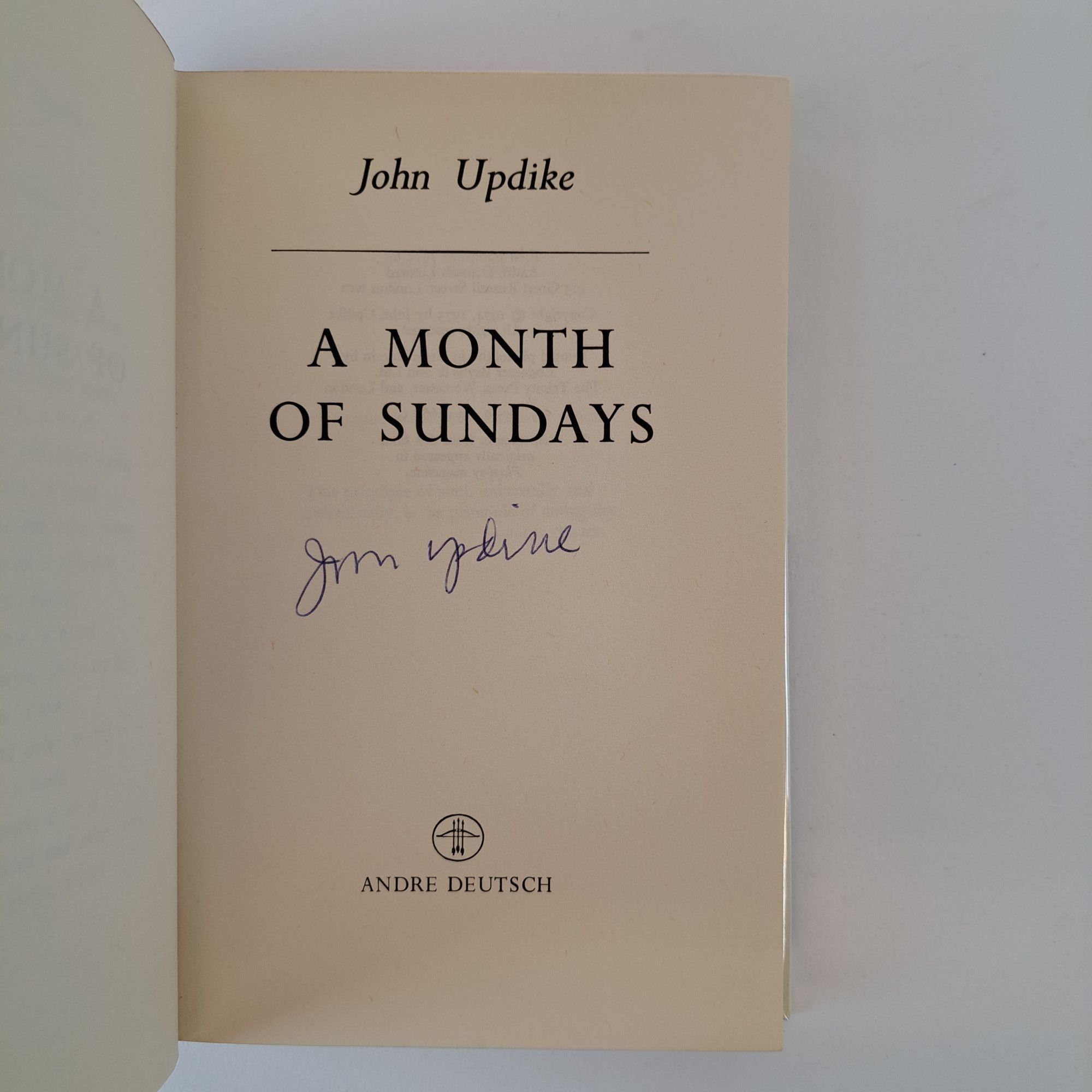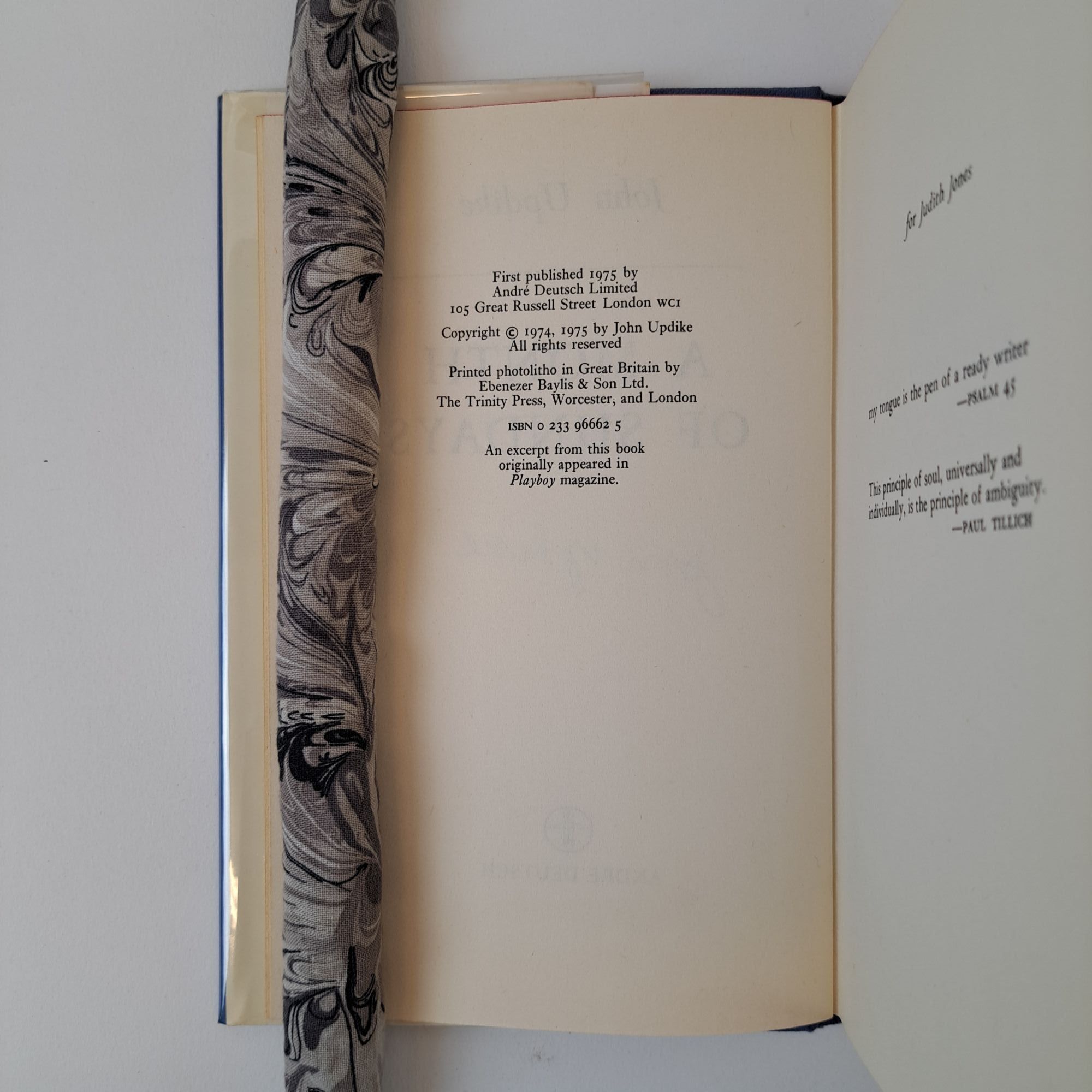 London, UK: Andre Deutsch, 1975. First U.K. Edition, First Printing. Hardcover. Octavo, 228 pages. In Very Good condition with a Very Good condition dust jacket. Blue spine with red and white lettering. Dust jacket is wrapped in a mylar covering, price uncut "£2.95 net", has general shelving wear. Boards have mild age toning along the edges, and a small stain on the rear tail edge. Textblock has mild wear along the edges. Signed flat by John Updike on the title page. Shelved in Room C. 1394693. Special Collections.