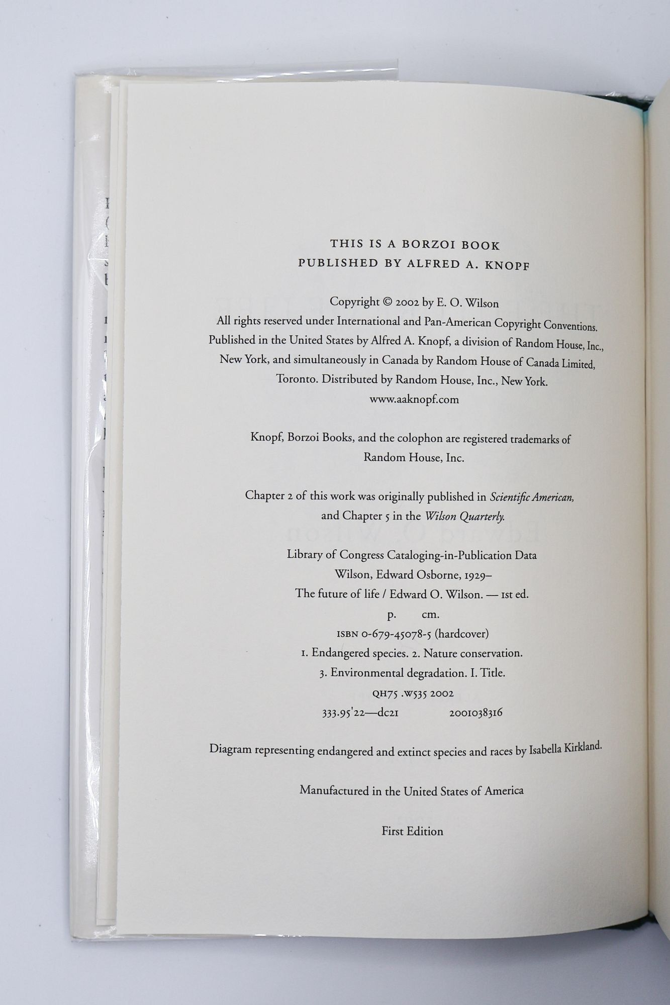 New York: Alfred A. Knopf, 2002. First Edition, First Printing. Hardcover. Octavo, xxiv, 229 pages. In Very Good condition with a Very Good dust jacket. Spine black with white lettering. Dust jacket protected in mylar covering, with price uncut: "$22.00." Light creasing and scuffing to covers. Some bleeding from spine onto top edge of textblock and pastedowns. Interior pages clean. Inscribed by Edward Wilson on front free endpaper reading, "For Cynthia and Steven Brill / With many thanks for your help in global conservation / Edward O. Wilson." Inscription accompanied with small doodle. DL consignment. Shelved in Case 10. 1394736. Shelved Dupont Bookstore.