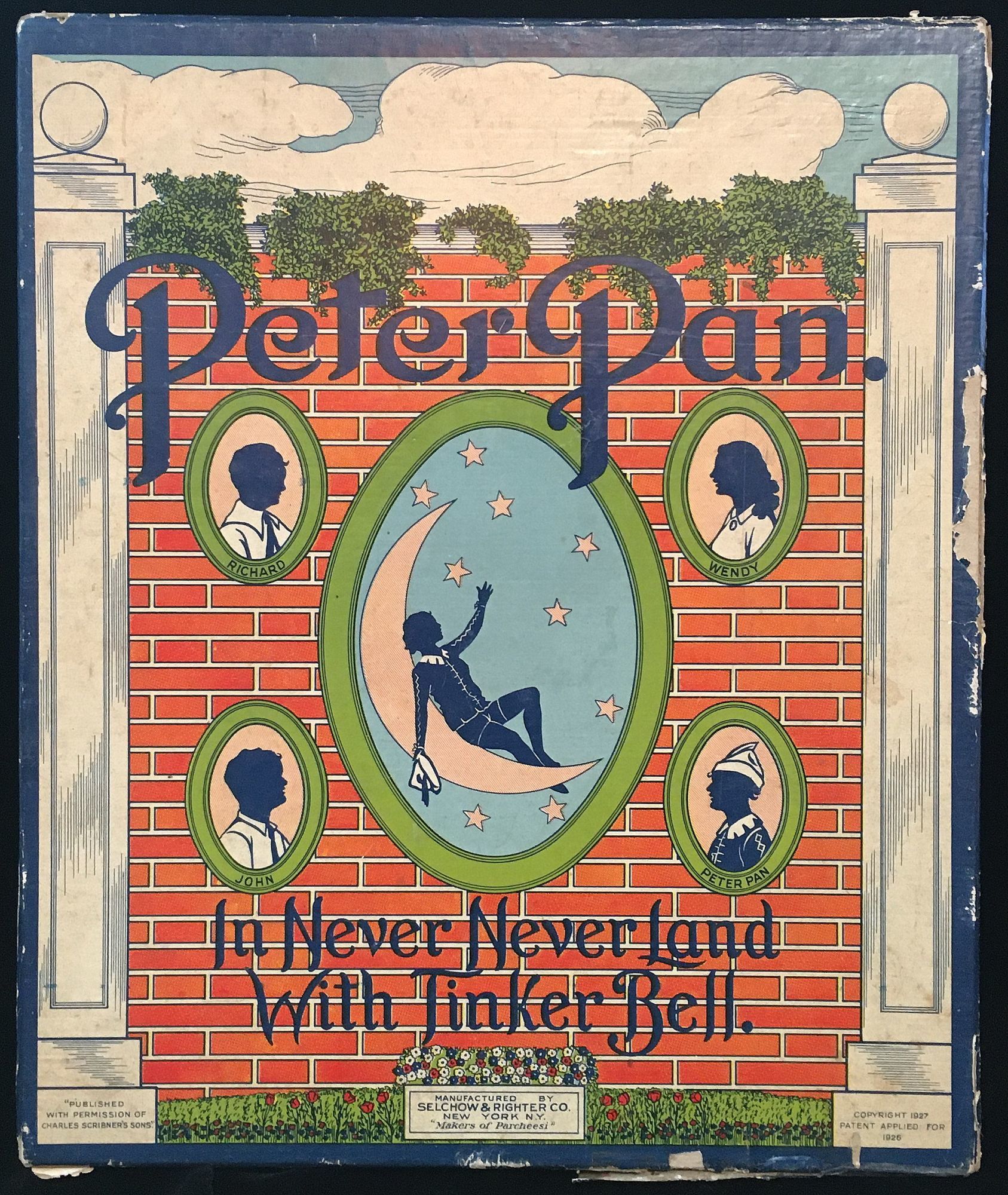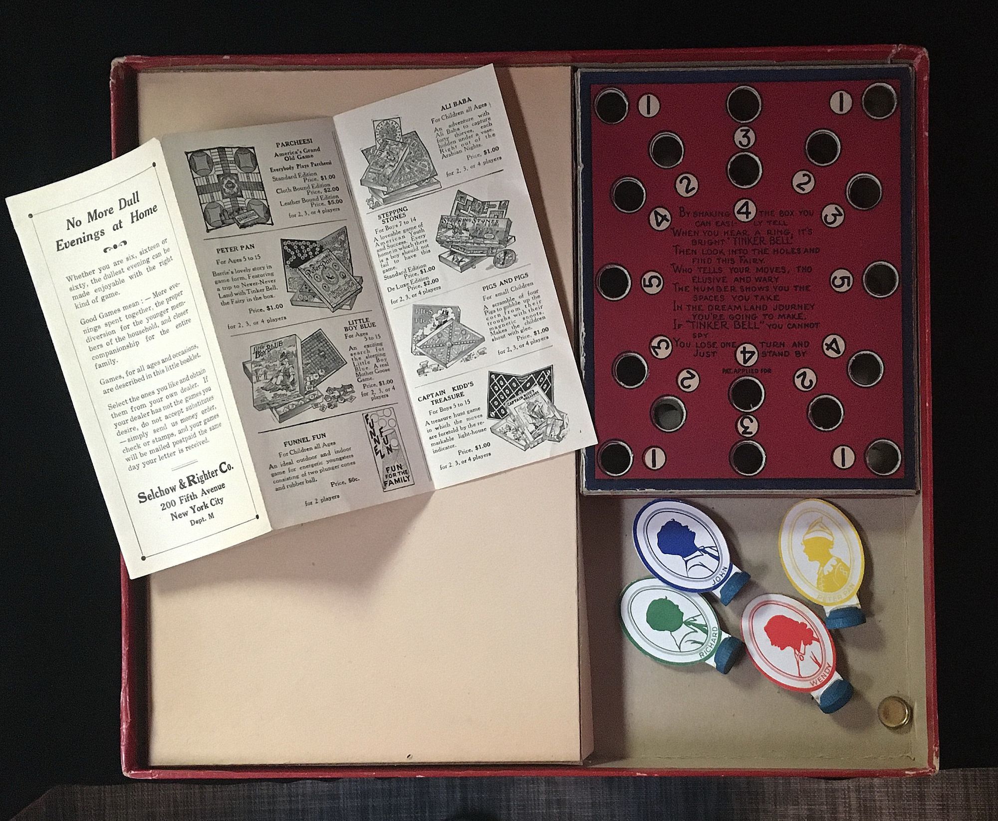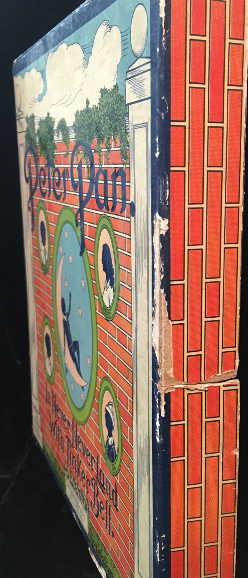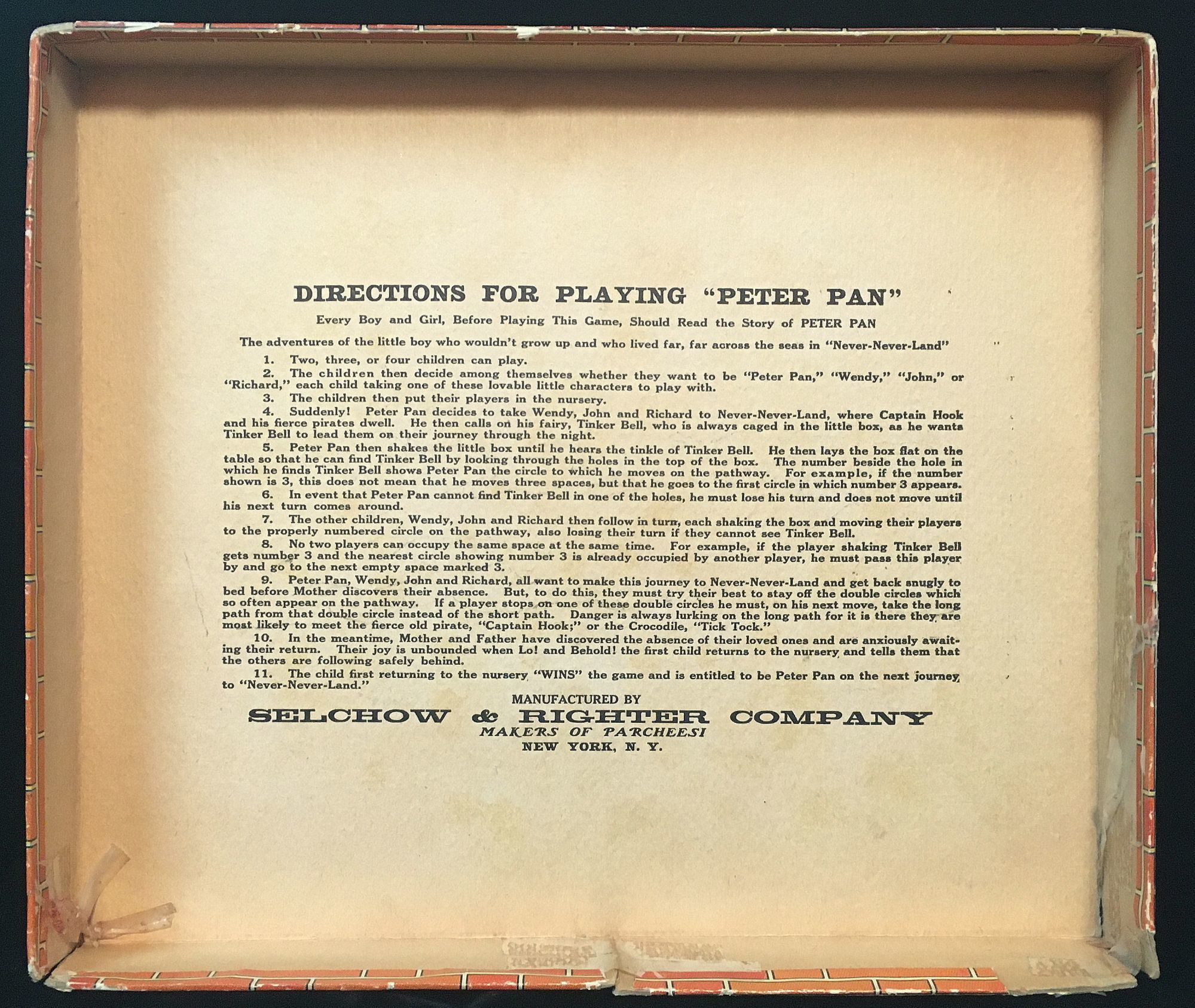 New York: Selchow & Righter Co., Published with Permission of Charles Scribner's Sons, 1927. Unfortunately some edge wear and paper lose on box lid with some apron separations and old tape repair.. A single-fold 12.5 by 21.25" litho on board game board with vignettes form the Peter Pan tale including the children's bedroom, the Jolly Rogers and of course Never Never Land. A winding playing path that begins and ends at the same location on the board. Also includes a 6.5" by 5.5" box to be shaken by the players to determine the number of spaces to move. There is a "Tinker Bell" within the box that dings when hit by the medal ball. The ball will drop in a hole to indicate the moves. If the ball doesn't land in a hole, the player loses his turn. Four (4) die-cut playing pieces (Richard, John, Wendy & Peter Pan). A litho on pasteboard two part box. Instructions printed on inside of the box lid. Also includes an 8 pp. catalogue of other Selchow & Righter games. A scarce item.