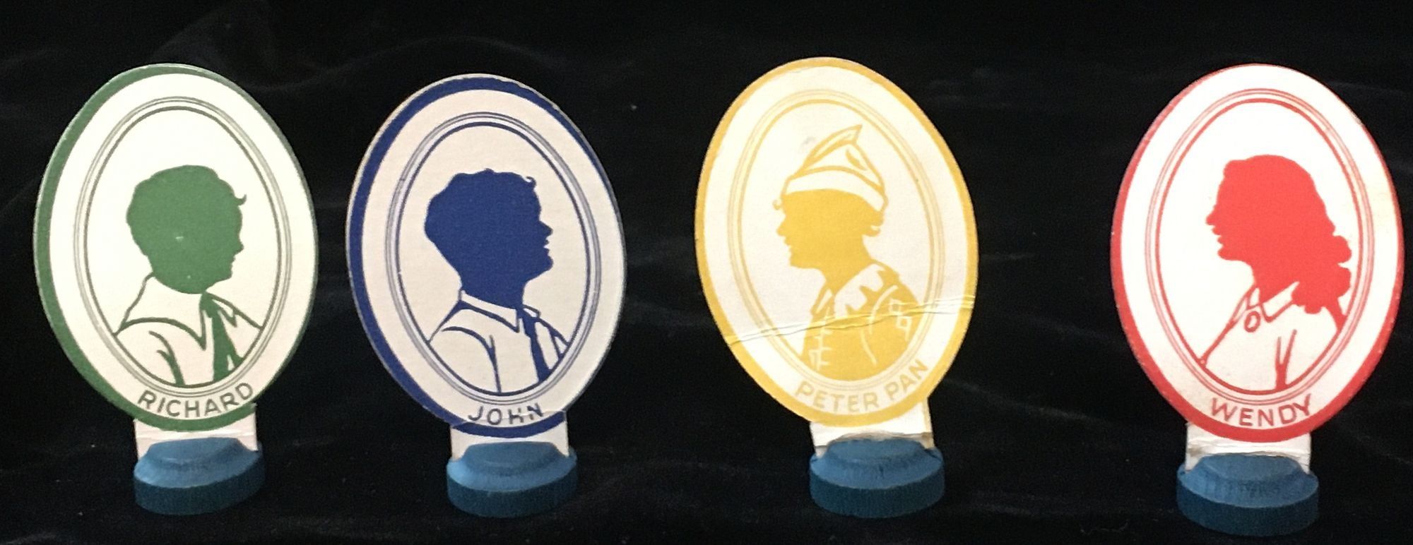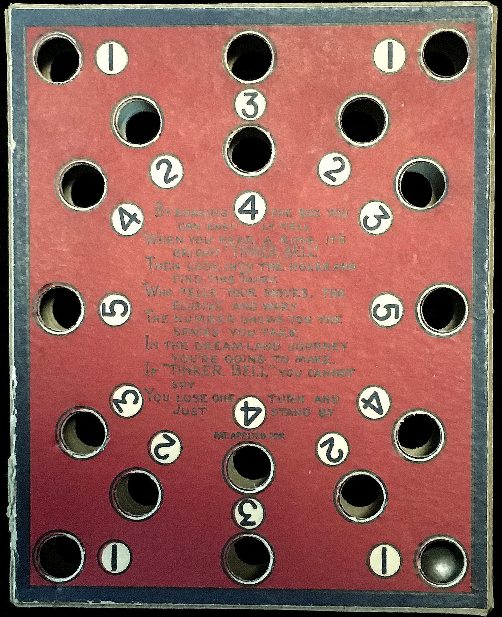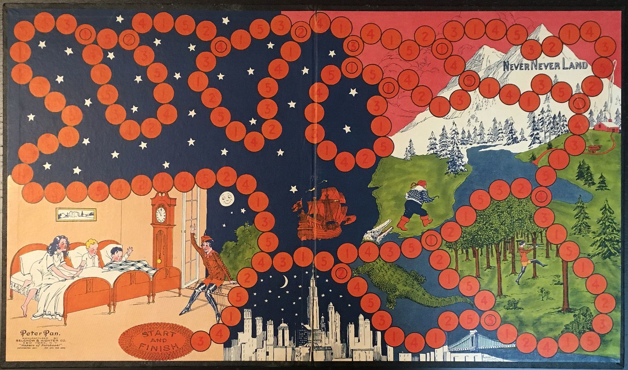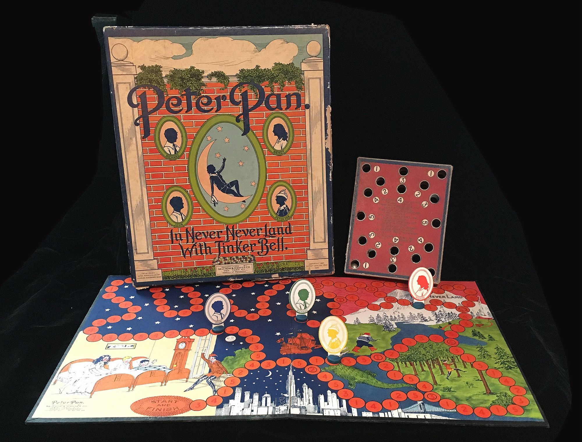 New York: Selchow & Righter Co., Published with Permission of Charles Scribner's Sons, 1927. Unfortunately some edge wear and paper lose on box lid with some apron separations and old tape repair.. A single-fold 12.5 by 21.25" litho on board game board with vignettes form the Peter Pan tale including the children's bedroom, the Jolly Rogers and of course Never Never Land. A winding playing path that begins and ends at the same location on the board. Also includes a 6.5" by 5.5" box to be shaken by the players to determine the number of spaces to move. There is a "Tinker Bell" within the box that dings when hit by the medal ball. The ball will drop in a hole to indicate the moves. If the ball doesn't land in a hole, the player loses his turn. Four (4) die-cut playing pieces (Richard, John, Wendy & Peter Pan). A litho on pasteboard two part box. Instructions printed on inside of the box lid. Also includes an 8 pp. catalogue of other Selchow & Righter games. A scarce item.