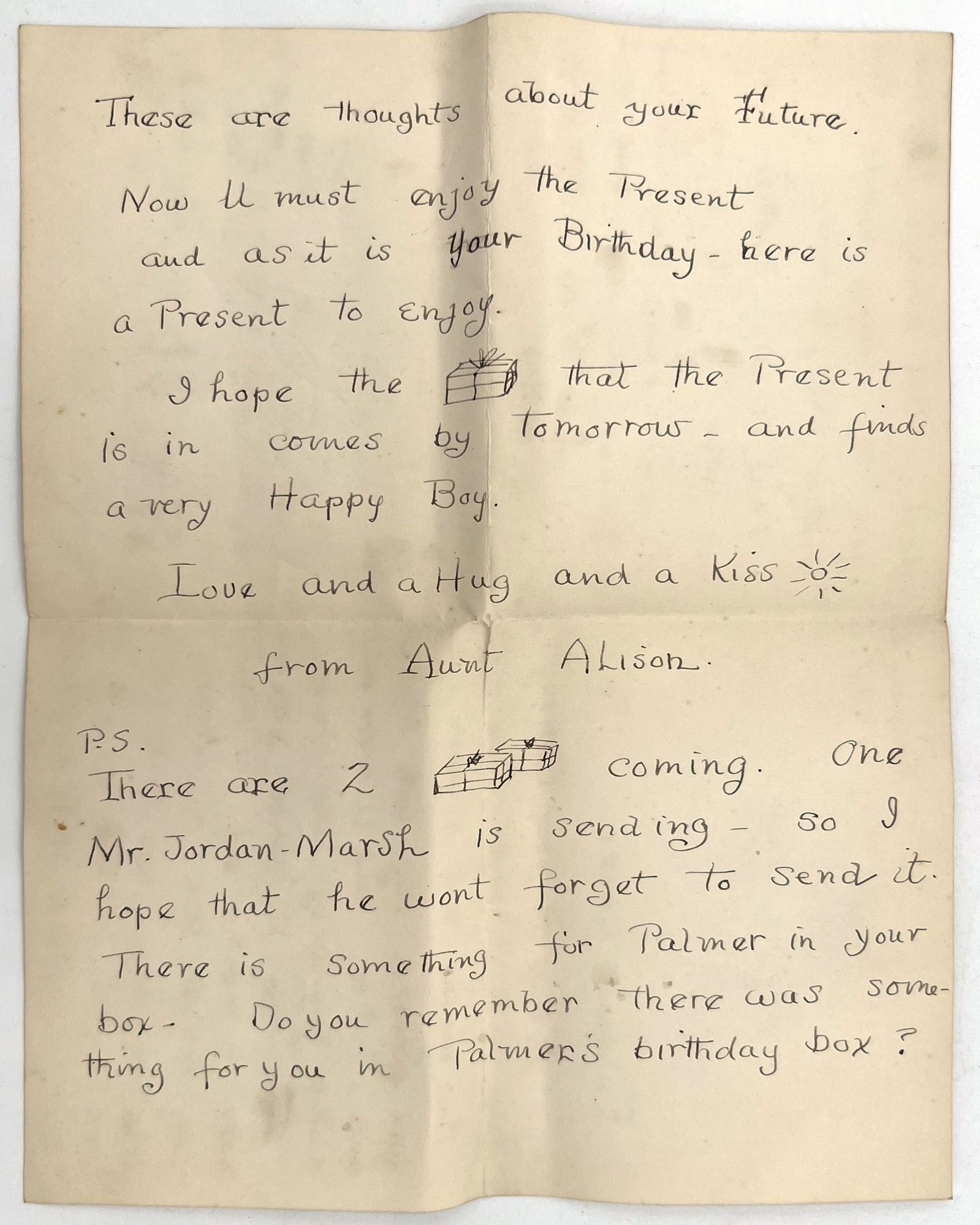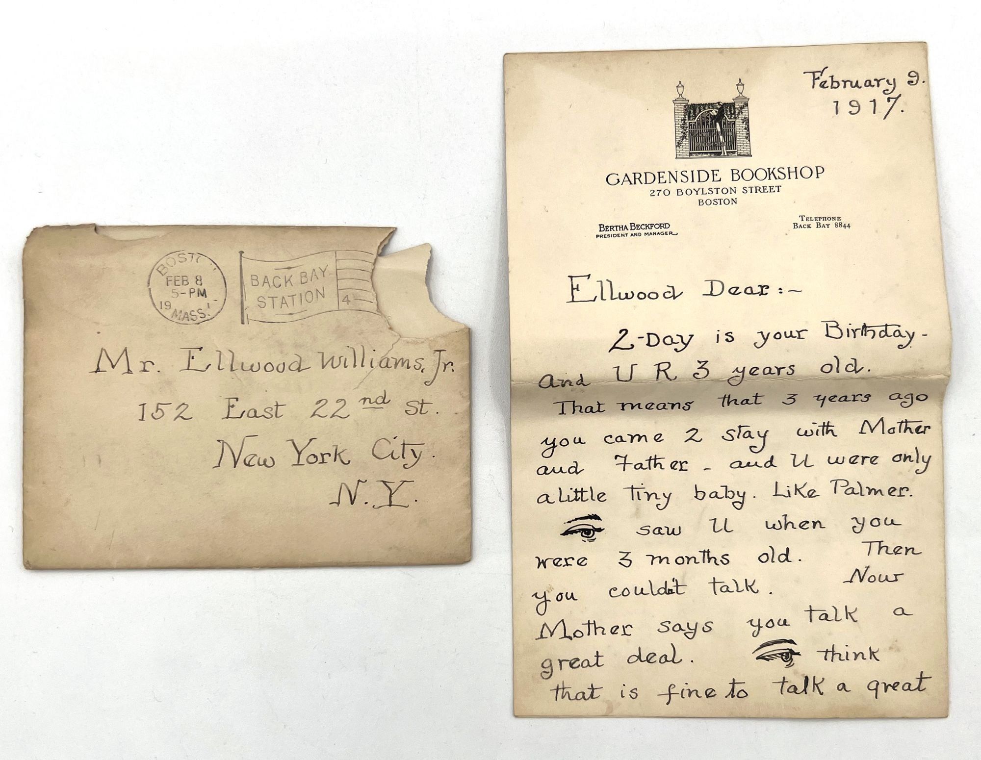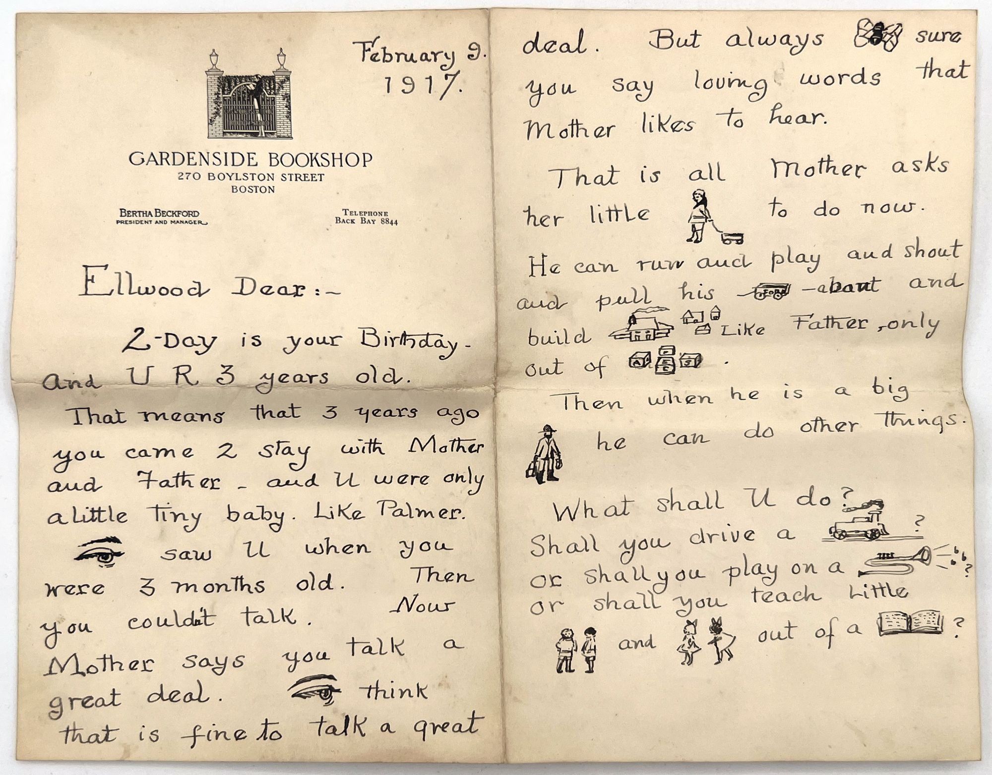 Boston, Massachusetts, 1917. Very good. Toned, letter folds. Tears to envelope including larger open tear, stamp missing.. A playful birthday message in the form of a rebus letter, send in February 1917 from "Aunt Alison" to her three-year-old nephew, Elwood Williams III. It begins, "Ellwood [sic] Dear: 2-Day is your Birthday- and U R 3 years old. That means that 3 years ago you came 2 stay with Mother and Father - and U were only a tiny little baby..." The remainder of the letter uses pictures to replace words, including: an eye; a bee; a boy; a train; a book; a trumpet; and presents. The content is particularly charming, as it shows the aunt's love and her musings on what he will be when he grows up: "What shall U do? Shall you drive a [train]? Or shall you play on a [trumpet]? Or shall you teach little [boys] and [girls] out of a book?" She ends with promises of presents. Written in large letters to help the little boy read (probably with the aid of his parents). Very sweet. Letter written on letterhead of Boston's Gardenside Bookshop. Bifolium (8" by 5"), housed in original postmarked and hand-addressed envelope measuring 4" by 5" Elwood Williams III (1914-1982) became a respected State Dept. employee and expert on U.S.-German relations following WWII. Williams joined the Foreign Service in 1940, was assigned to Winnipeg, and then served as a Navy officer during the war. He graduated from the Georgetown University School of Foreign Service in 1948, and returned to the State Dept. where he spent the remainder of his career assigned to the Bureau of German Affairs. He was diagnosed with Multiple Sclerosis in 1945, and received accolades throughout his career for excellence in service despite his physical limitations.