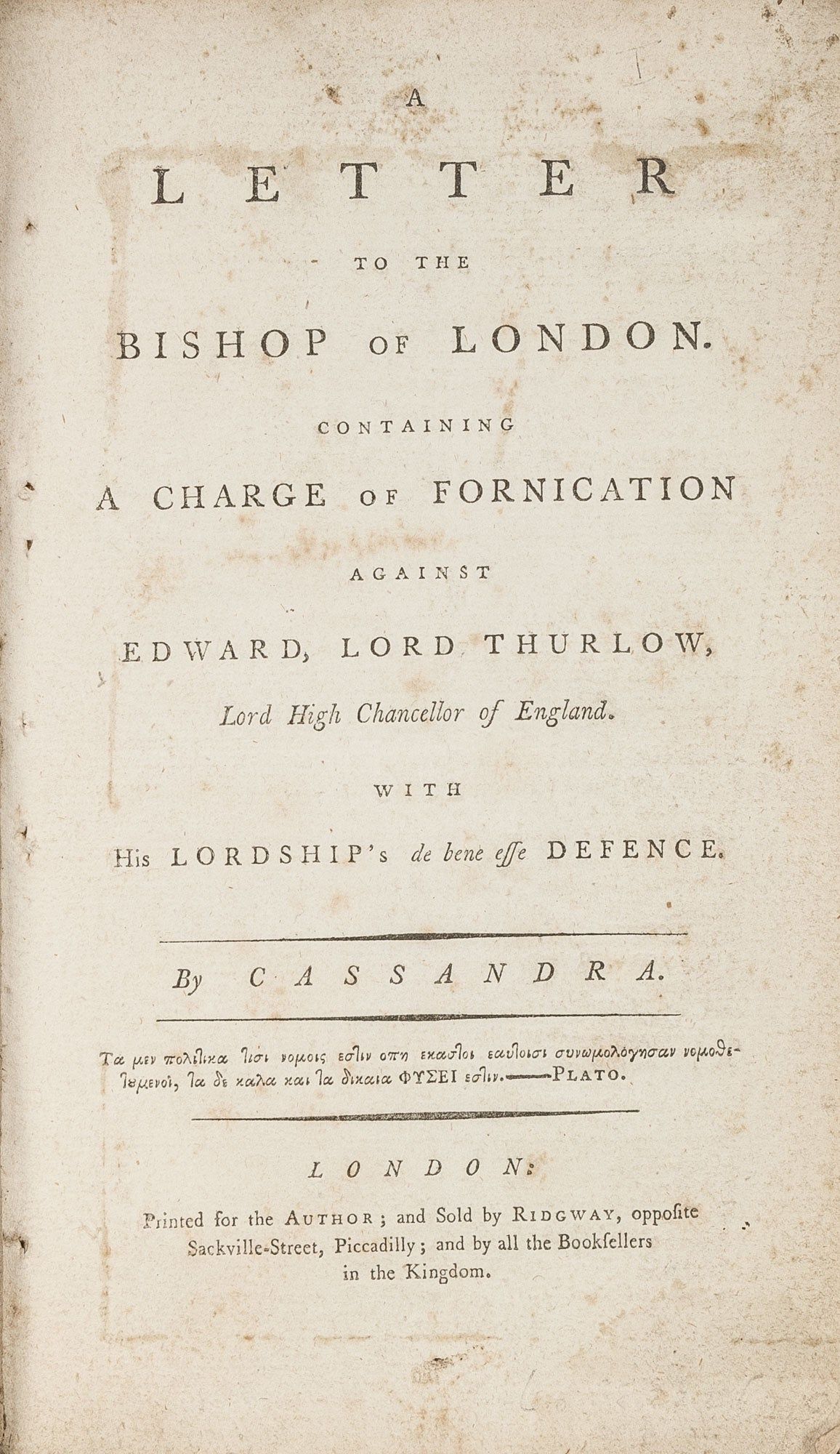 1788. Charges of Immorality and Fornication Against the Lord High Chancellor Cassandra. [Thurlow, Edward (1731-1806), 1st Baron Thurlow]. A Letter to the Bishop of London. Containing a Charge of Fornication Against Edward, Lord Thurlow, Lord High Chancellor of England. With His Lordship's de bene esse Defence. London: Printed for the Author; and Sold by Ridgway, [1787?]. 50 pp. Octavo (8-1/4" x 5"). Disbound stab-stitched pamphlet in later plain wrappers. Light soiling and edgewear to wrappers, moderate toning to interior, light foxing in a few places, light soiling and faint offsetting to title page. $450. * Only edition. Thurlow was a lawyer and Conservative politician who served as Lord High Chancellor for fourteen years. He was known not only for his loyalty to George III and skill in the courtroom, but as the father of a number of illegitimate children. This wide-ranging polemic accuses him of fornication with a young woman named Mary Edmonds, anticipates his defense, and then moves on to a discussion of tax policy and the Test Acts. It draws on various classical, biblical and legal authorities, such as Blackstone, to support its assertions. (The pseudonym is likely a reference to the Cassandra of Greek mythology.) The ESTC assigns this pamphlet a provisional date of 1788, but a contemporary review appeared in a 1787 issue of The Monthly Review describing it as a "strange...performance" but noting that the editors were certainly "much amused." The Monthly Review Vol. 77 (August 1787) 167. Not in Halkett & Laing. English Short-Title Catalogue (ESTC) T38222. Rose, Register of Erotic Books 4545.