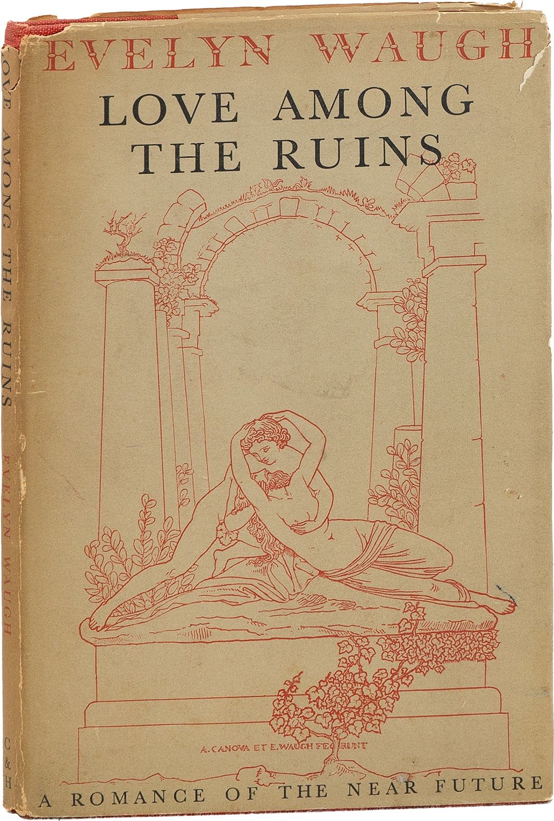 London: Chapman & Hall, 1953. First Edition. Octavo (20cm); red cloth-covered boards, with titling and decorations stamped in gilt on spine and front cover; red topstain; dustjacket; 51pp; frontispiece illustration, with black and white illustrations throughout. Shelf-soil to covers, gilt lightly oxidized, with light rubbing to board edges, and bookshop sticker and light soil to rear pastedown; Very Good. Dustwrapper, unclipped (priced 6s. net), tanned with soil, chip to upper spine panel (affect to title), 0.5" tear to upper front panel, and creases to extremities; Good. Waugh's satirical novel explores a dystopian Britain, and focuses on a man's relationship with a bearded woman and his habits with arson. Illustrations throughout text are by a variety of artists, including Waugh. [84373].